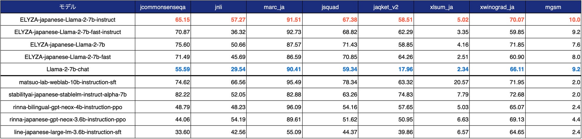 ・性能評価結果(ELYZA Tasks 100、ならびにlm-evaluation-harnessによる)
