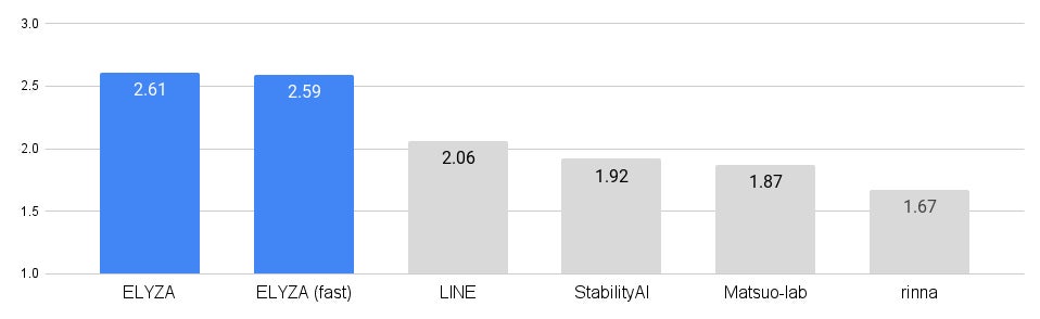 ※ELYZA独自作成の「ELYZA Tasks 100」による性能評価。データセットの詳細と具体的な結果についても技術ブログにて公開。