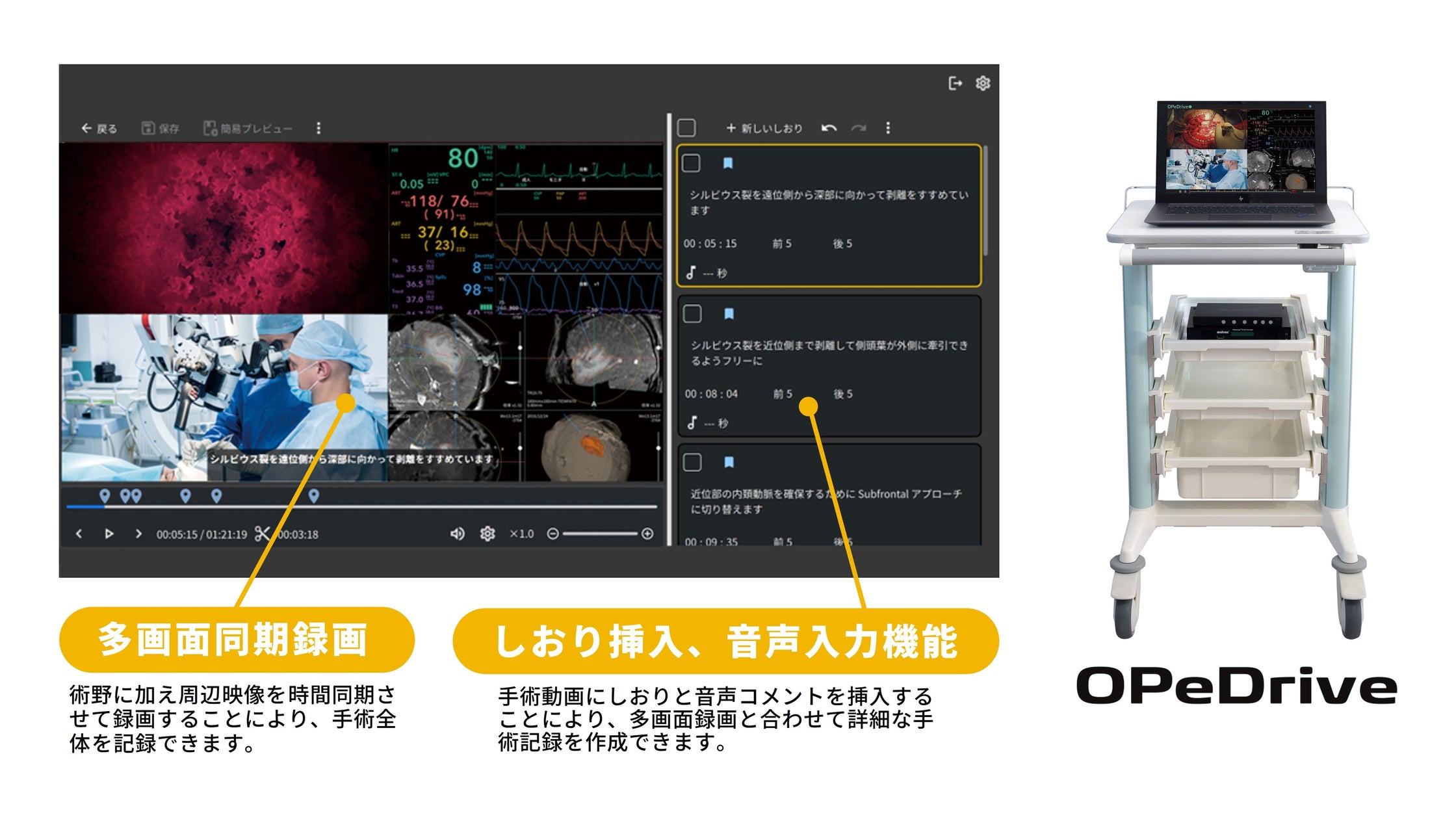 - 音声によるしおり挿入機能: 手術中に音声でしおりを挿入することができます。音声はリアルタイムで文字起こしされ、音声データと合わせてテキスト情報として記録されます。これにより、後の編集作業を効率化し、ダイジェスト動画の簡単な作成が可能です。