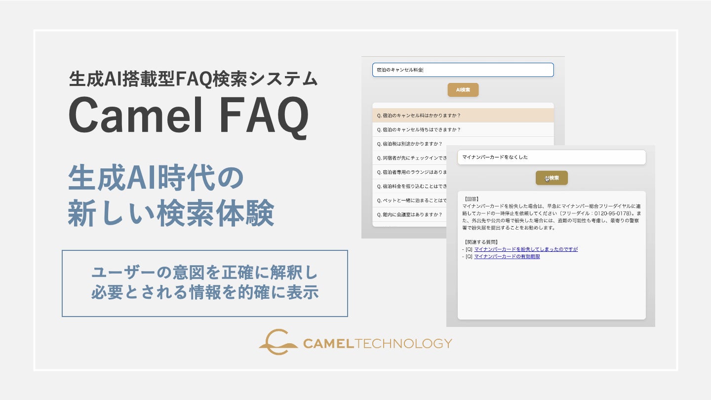 株式会社キャメルテクノロジー(本社:東京都世田谷区、代表取締役:松岡 遼馬)は、生成AI搭載型のFAQ検索システム「Camel FAQ」の提供を開始しましたので、お知らせします。「Camel FAQ」は生成AIを活用した検索技術により、顧客が調べたい内容に対して正確な回答を返すFAQシステムです。ユーザーの自己解決率を高めることで、コンタクトセンターの入電数を削減し、業務効率化に貢献します。