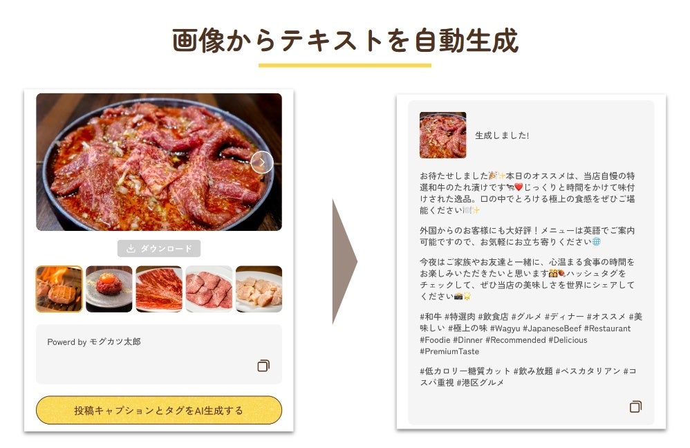 モグカツに登録した店舗情報も考慮したうえで写真の特徴をAIが読み取り、お店と料理の特徴を反映したキャプションの生成が可能です。本機能は、飲食店のSNSアカウント運用をサポートするBASICプランに追加いたします。