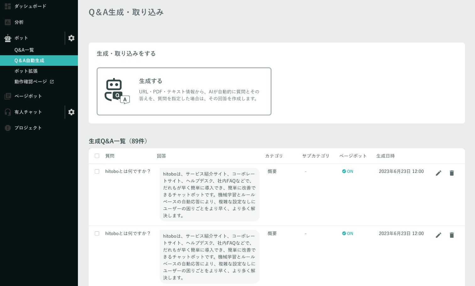 hitoboで新たに提供する機能は、PDFやURLの読み込みだけで、指定した数のQ&Aを生成できるようになります。同時にQ&Aのカテゴリー分類も自動作成します。