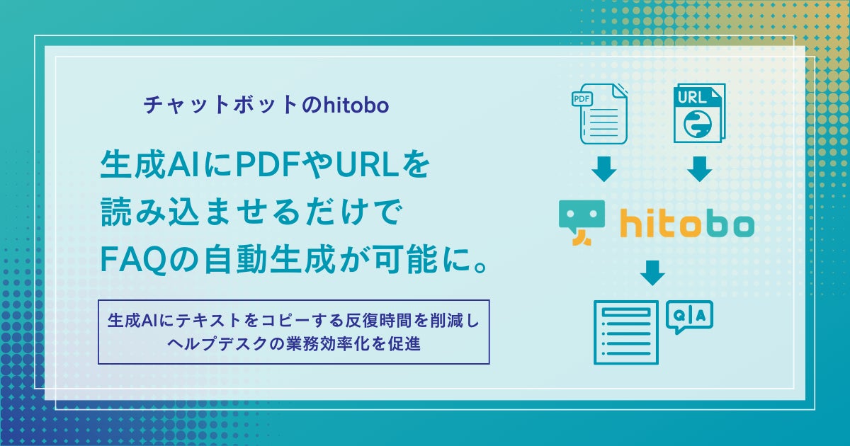 デジタルエコノミー特化のカスタマーサクセスソリューション・プロバイダーであるアディッシュ株式会社(本社:東京都品川区、代表取締役 江戸 浩樹、証券コード:7093、以下 アディッシュ)は、ヘルプデスクの業務効率化や生産性の向上を目的に、ノーコード・チャットボットのhitoboで、PDFやURLを直接読み込ませるだけで、生成AIによってFAQ(※1)を自動生成できる機能を追加します。