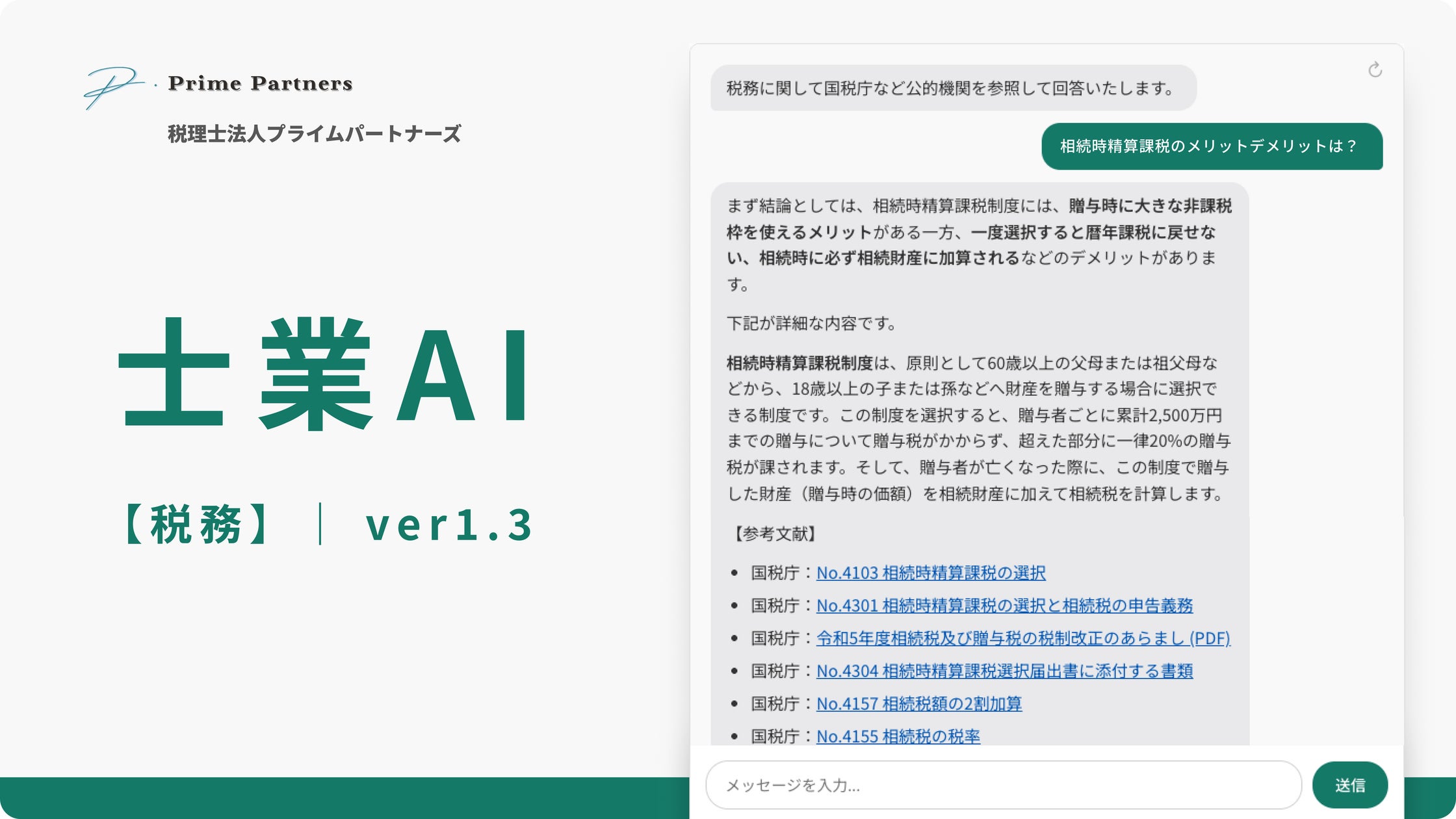 2025年3月31日、税理士法人プライムパートナーズ(本社:東京都港区赤坂)は、士業特化型AIサービス『士業AI』の提供を開始します。この新サービスは、税務や会計・法務などに関する不安や疑問を、公的な情報に基づいてスピーディかつ正確に解決することを目的としたAIチャットツールです。詳細はhttps://tax.prime-partners.co.jp/ai-zeimu/にてご確認いただけます。