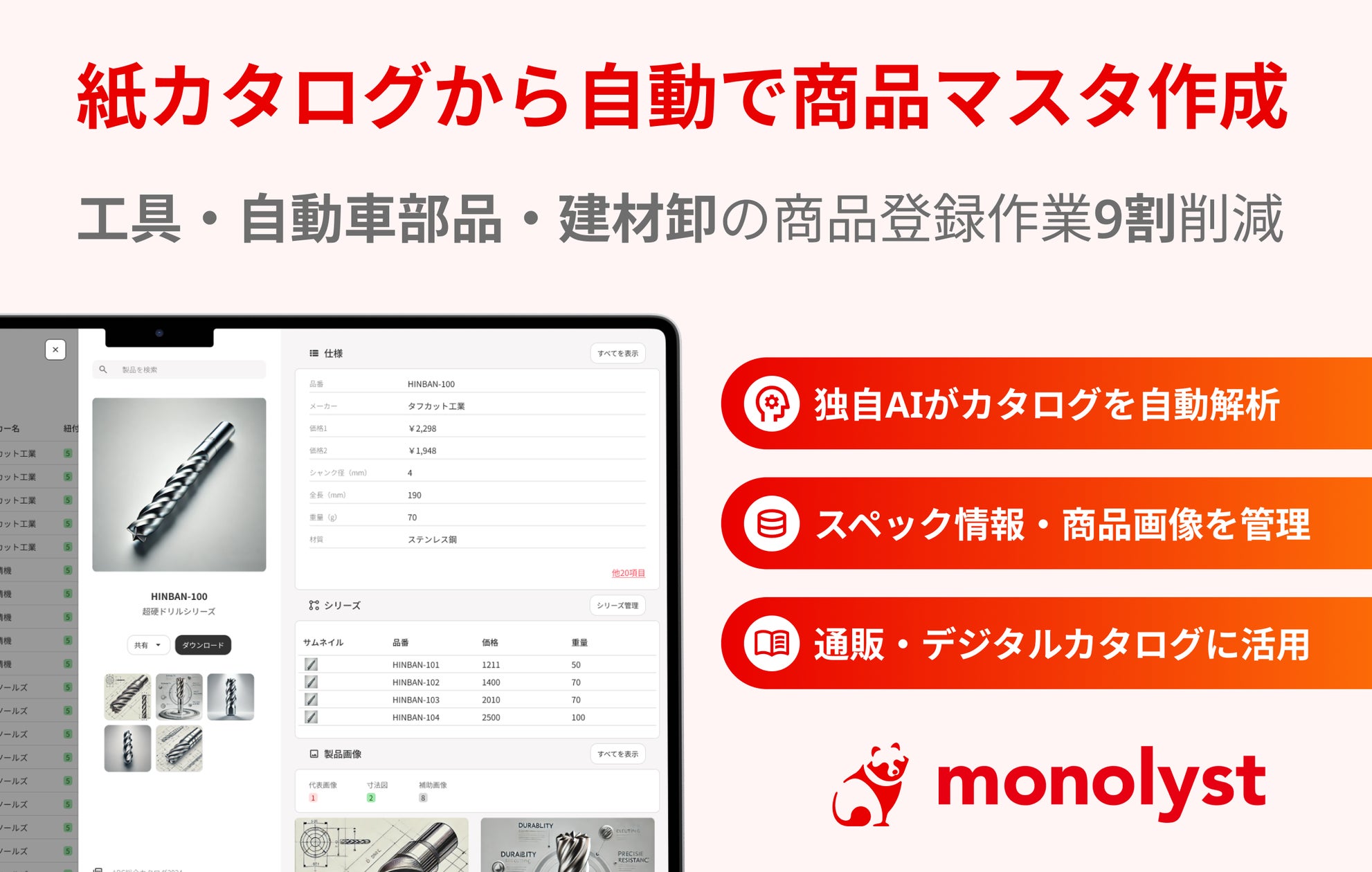 monolyst株式会社(本社:東京都渋谷区、代表取締役:伊関 洋介、以下「当社」)は、工具卸の転記作業をなくす商品情報管理システム 「monolyst(モノリスト)」を2025年4月2日より提供開始することをお知らせします。