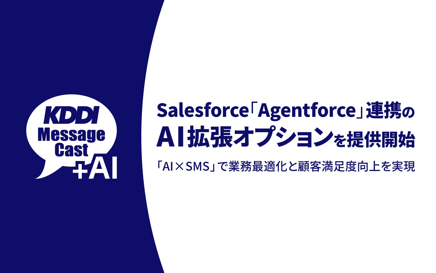 KDDIとSupershipは2025年3月17日、法人向けメッセージ配信サービス「KDDI Message Cast( https://kddimessagecast.jp/ )」(以下 本サービス)において、Salesforceの自律型AIエージェント「Agentforce」と連携し、AIによるSMSメッセージの自動生成と自動送信が可能な「KDDI Message Cast for Salesforce AI拡張オプション」(以下 本オプション)を追加します。