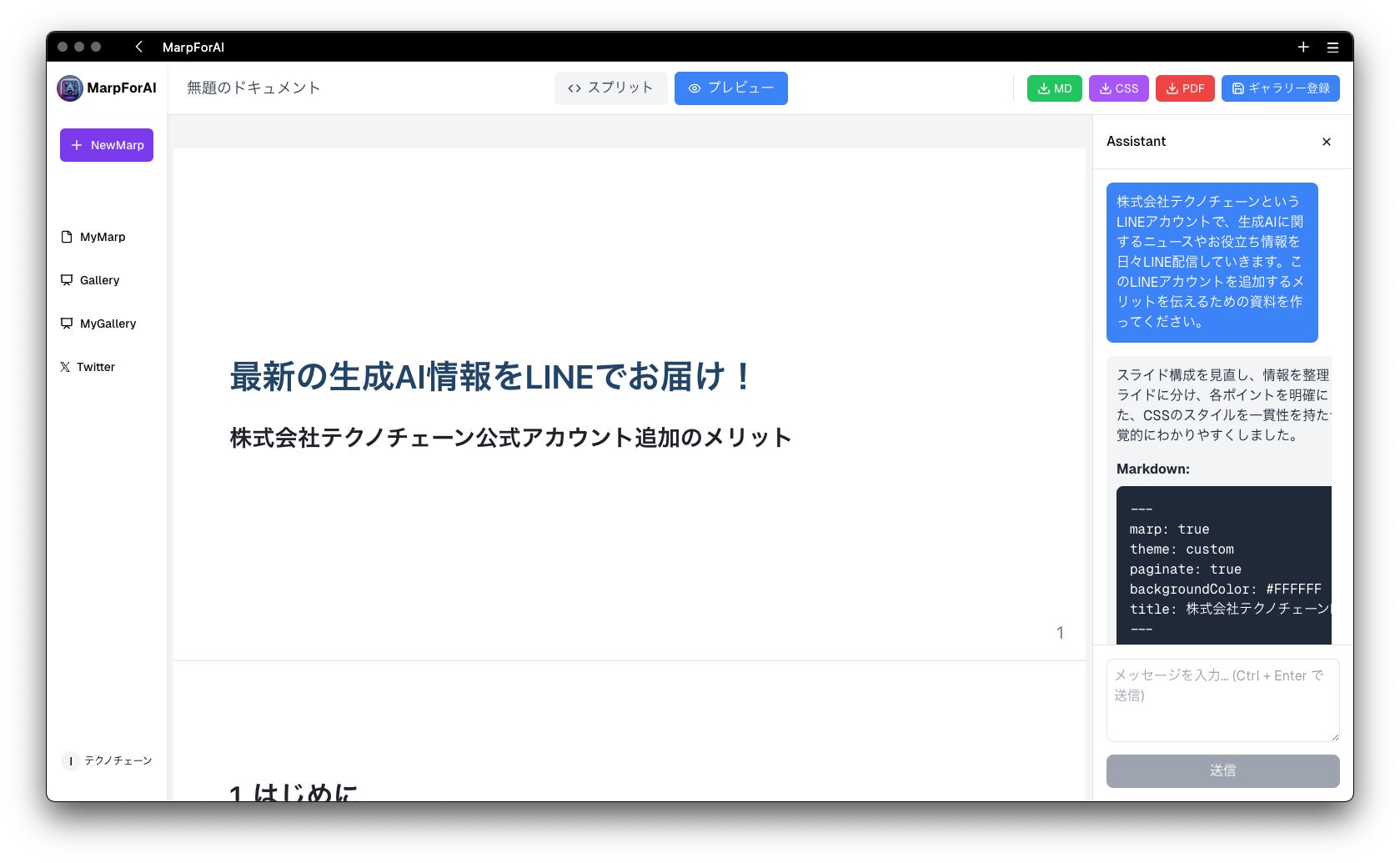株式会社テクノチェーンは、迅速なプロトタイプ開発を通じて、企業のアイデアをスピーディに形にし、ビジネスのスピードとクオリティを向上させます。これにより、中小企業の革新的な取り組みを支援し、競争力のある市場でのポジション確立をサポートします。ぜひ、MarpForAIで爆速開発の可能性を体験してください。