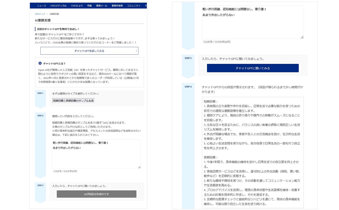 全国のケアマネジャー10万人が登録するウェブサイト「ケアマネジメント・オンライン」(https://www.caremanagement.jp/)、全国にリハビリ型デイサービス「レコードブック」(https://www.recordbook.jp/)を展開するなど、健康寿命の延伸に向け、様々なヘルスケアサービスを運営する株式会社インターネットインフィニティー(本社:東京都千代田区、代表取締役社長:別宮 圭一)は、話題の文書生成AI『ChatGPT』を、ケアマネジャーの皆様が業務で活用できる新機能の提供を開始しました。