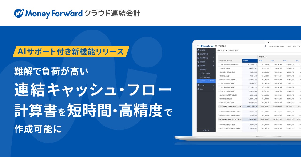 株式会社マネーフォワードは、『マネーフォワード クラウド連結会計』において、AIサポート付の「連結キャッシュ・フロー計算書 作成機能」(以下「本機能」)を提供開始しました。今回の機能提供では、従来のシステムにはない、シンプルなキャッシュ・フローの計算方式を採用し、AIによる科目変換のサポート、インストラクション(作業の目的や手順)を記載できるUIを搭載することで、連結決算担当者にとって難解かつ、負担が大きかった連結キャッシュ・フロー計算書(以下「連結CF」)の作成プロセスの効率化を実現します。