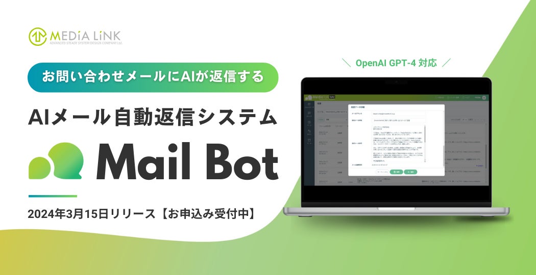 ChatGPT連携チャットボット「MediaTalkGAI」や、AI型FAQ検索システム「AI-FAQ」などを提供するメディアリンク株式会社(本社:東京都港区、代表取締役:松本 淳志、以下 メディアリンク)は、本日新たにAIがお問い合わせメールに自動返信する「メールボット」「メールボット」の提供を開始したことをお知らせします。