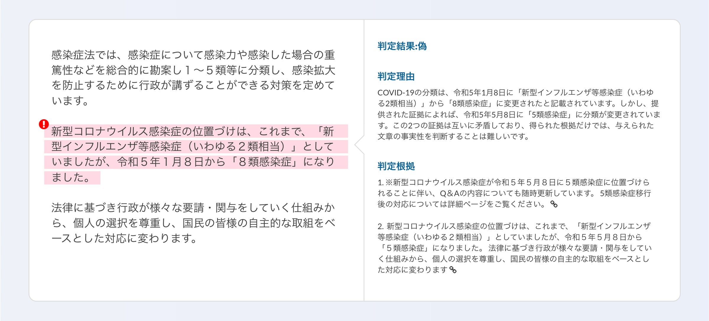 - 真偽の判定チェックしたい箇所と抽出した根拠を元に真偽の判定を行います。