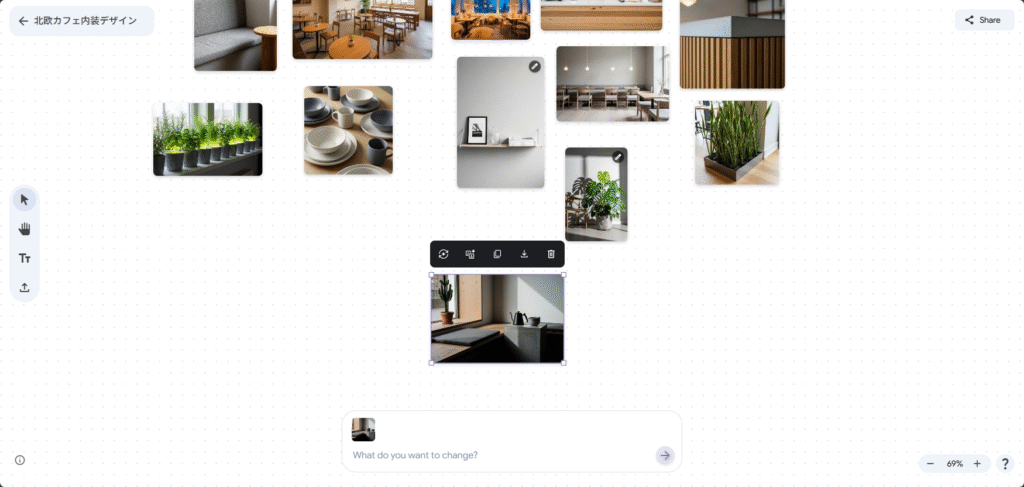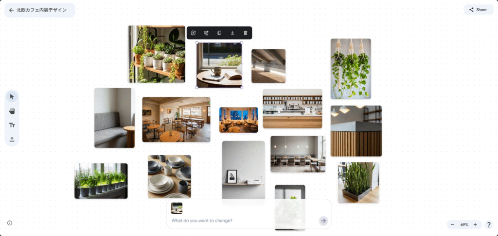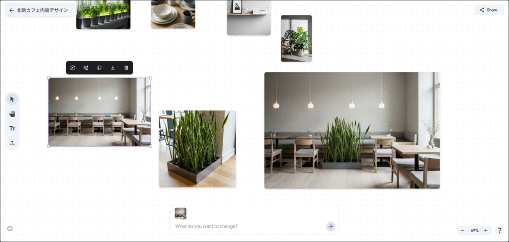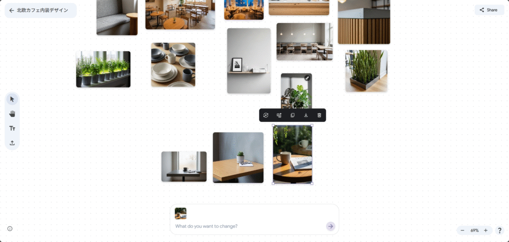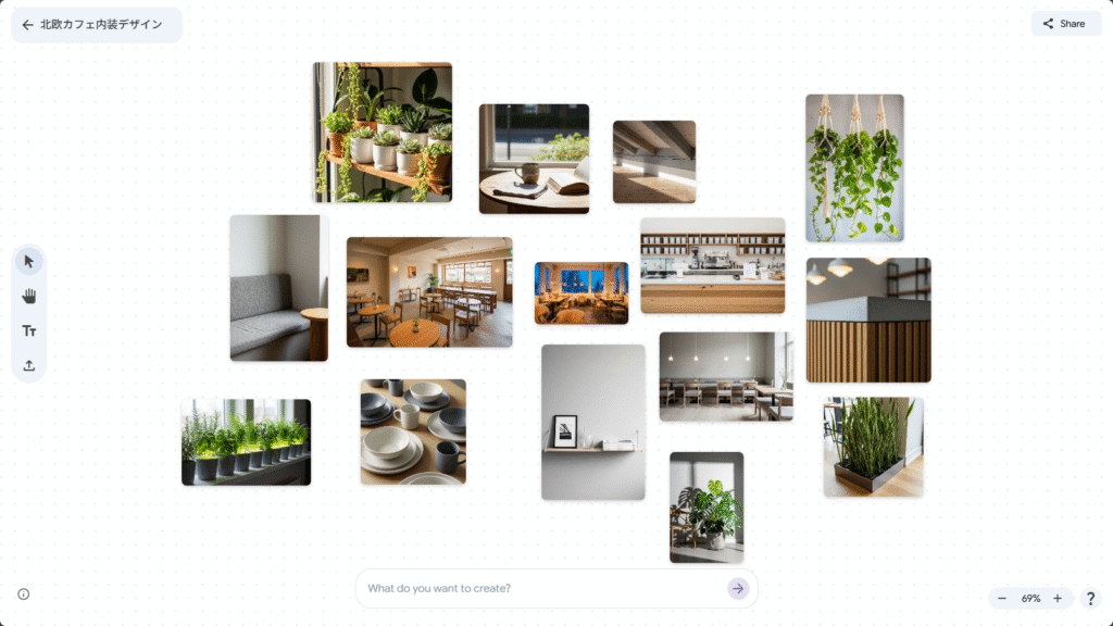 テキストで「北欧テイストの小さなリビングルーム、木製家具と観葉植物」「レトロな海外旅行ポスター風の世界観」などと指示すると、Mixboardが複数の画像と色味、構図のバリエーションを自動生成し、ボード上に並べてくれます。
