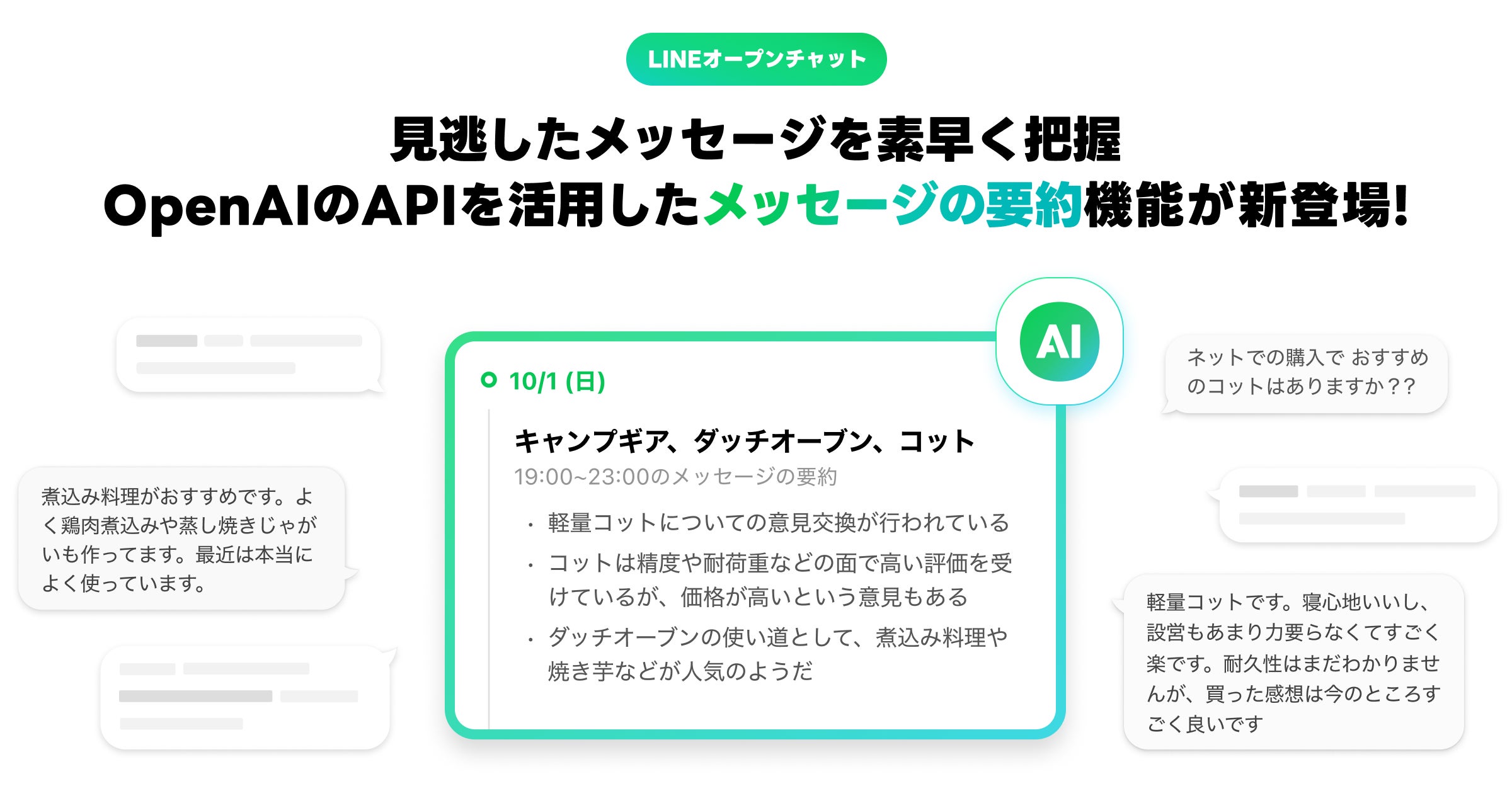 LINEヤフー株式会社(以下、LINEヤフー)は、「LINE」アプリ内の「LINEオープンチャット」(以下、オープンチャット)において、OpenAIの生成AIを利用し、トークルーム内のメッセージのやり取りを自動で要約する機能の提供を開始しました。