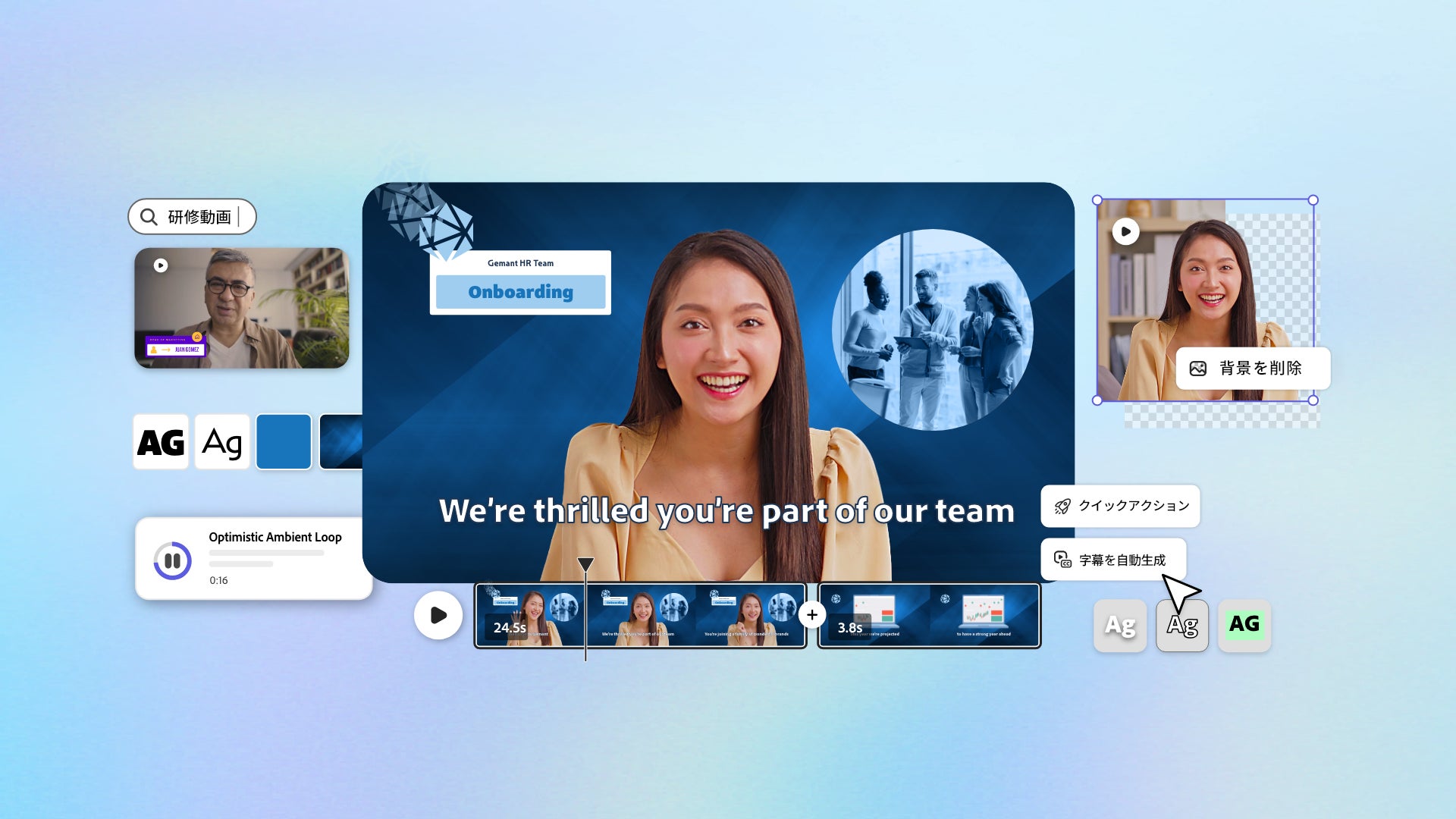 Adobe Expressの機能は、Firefly生成AIモデルによって強化されており、企業が自信を持ってアプリを広範に展開できるように設計されています。Adobe Fireflyを活用した進展には、「テキストからテンプレート生成」、「テキスト効果」、「生成塗りつぶし」などの機能や、自動翻訳などの他の機能が含まれています。これらの機能はAdobe Expressのワークフローに深く統合されており、マーケターがキャンペーンを迅速に展開し、制作準備が整ったアセットを瞬時に生成、翻訳、カスタマイズし、わずか数クリックで無限のバリエーションを作成できるようにします。
