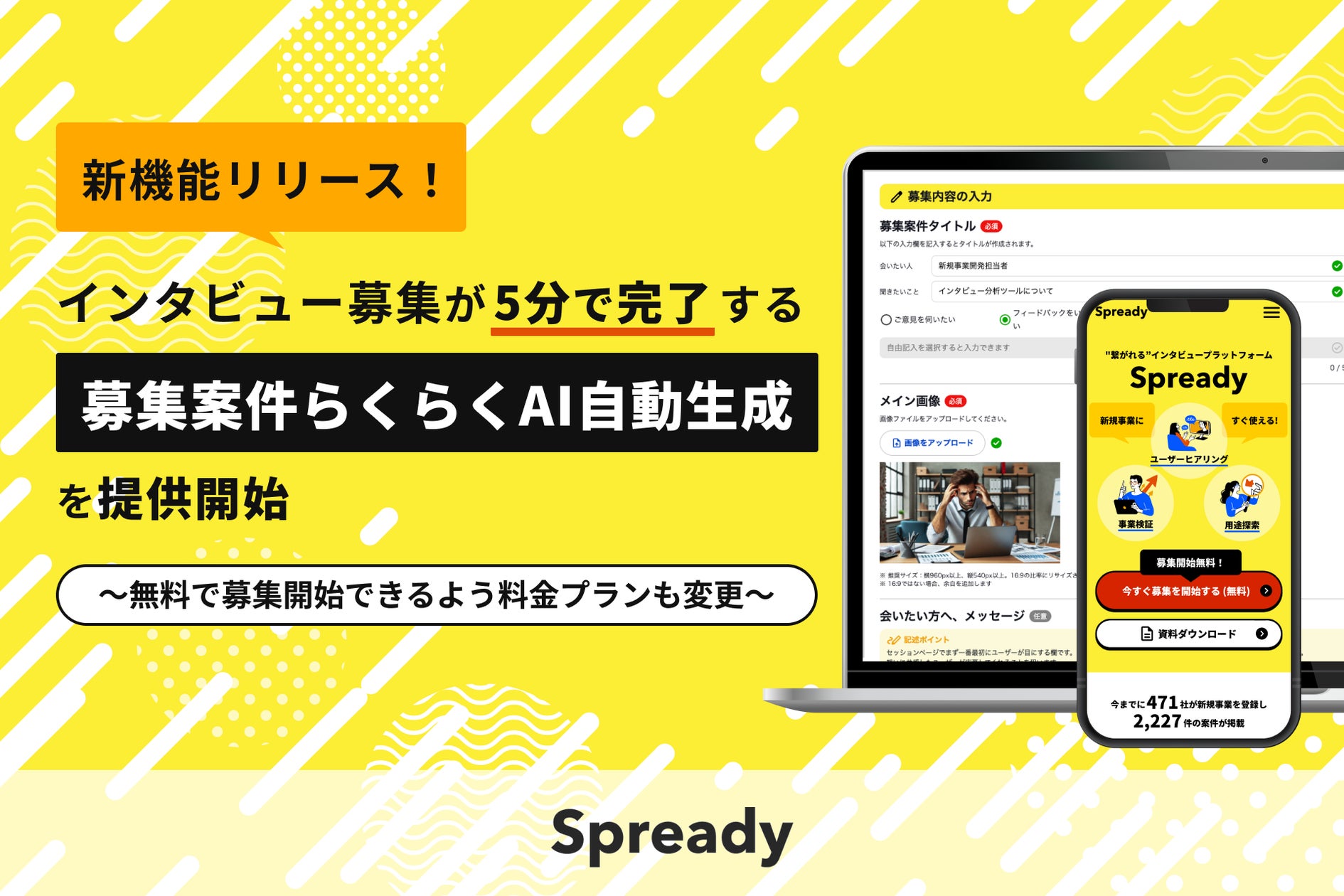 “繋がれる”インタビュープラットフォーム「Spready」を提供するSpready株式会社(本社:東京都渋谷区 代表取締役:佐古雅亮 以下「当社」)は、2024年8月1日より、募集案件らくらくAI自動生成機能を搭載し、わずか5分でインタビュー募集を開始できる機能の提供を開始いたしました。また、これまでの料金プランを変更し、インタビュー募集は無料で開始できるようになりました。利用企業ユーザーは利用料を支払ったのにも関わらず良いマッチングがないリスクを抱えずに、サービスを利用開始することが可能です。新規事業領域に特化したインタビュープラットフォームで、これまで累計2,200件の新規事業に伴走してきたSpreadyの利用がしやすくなることで、更なる新規事業の事業化スピードを早めます。