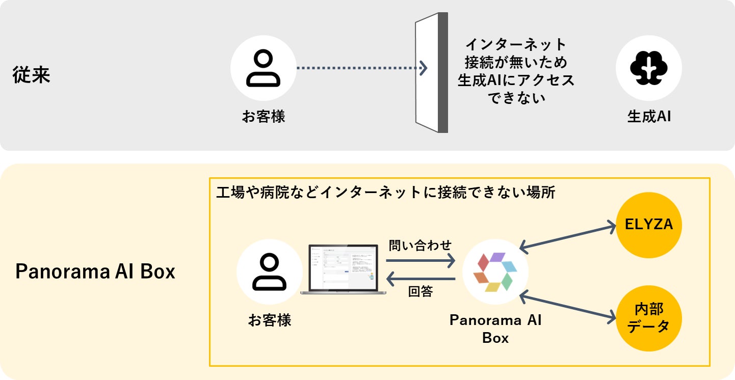 株式会社ELYZAの提供する大規模言語モデルである「Llama-3-ELYZA-JP-8B」は、オープンなモデルとして一般公開されているため、ダウンロードしてインターネット接続ができないオンプレミスの環境でも生成AIを活用することができます。「Panorama AI Box」はRAG技術を高度に活用してELYZAと内部データを組み合わせることにより、工場や病院内でも生成AIを活用することができます。