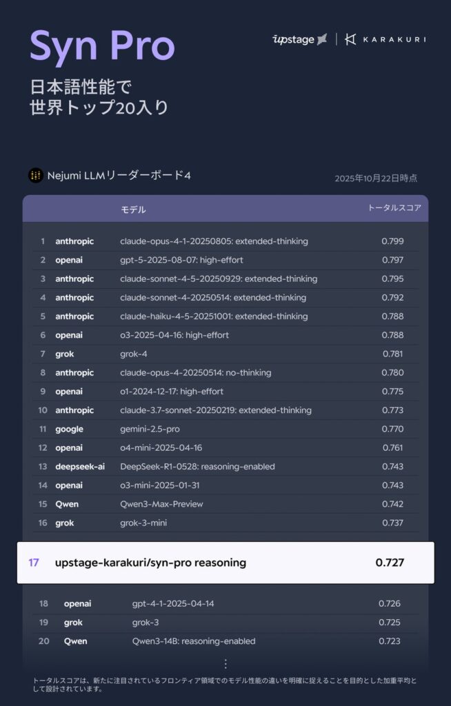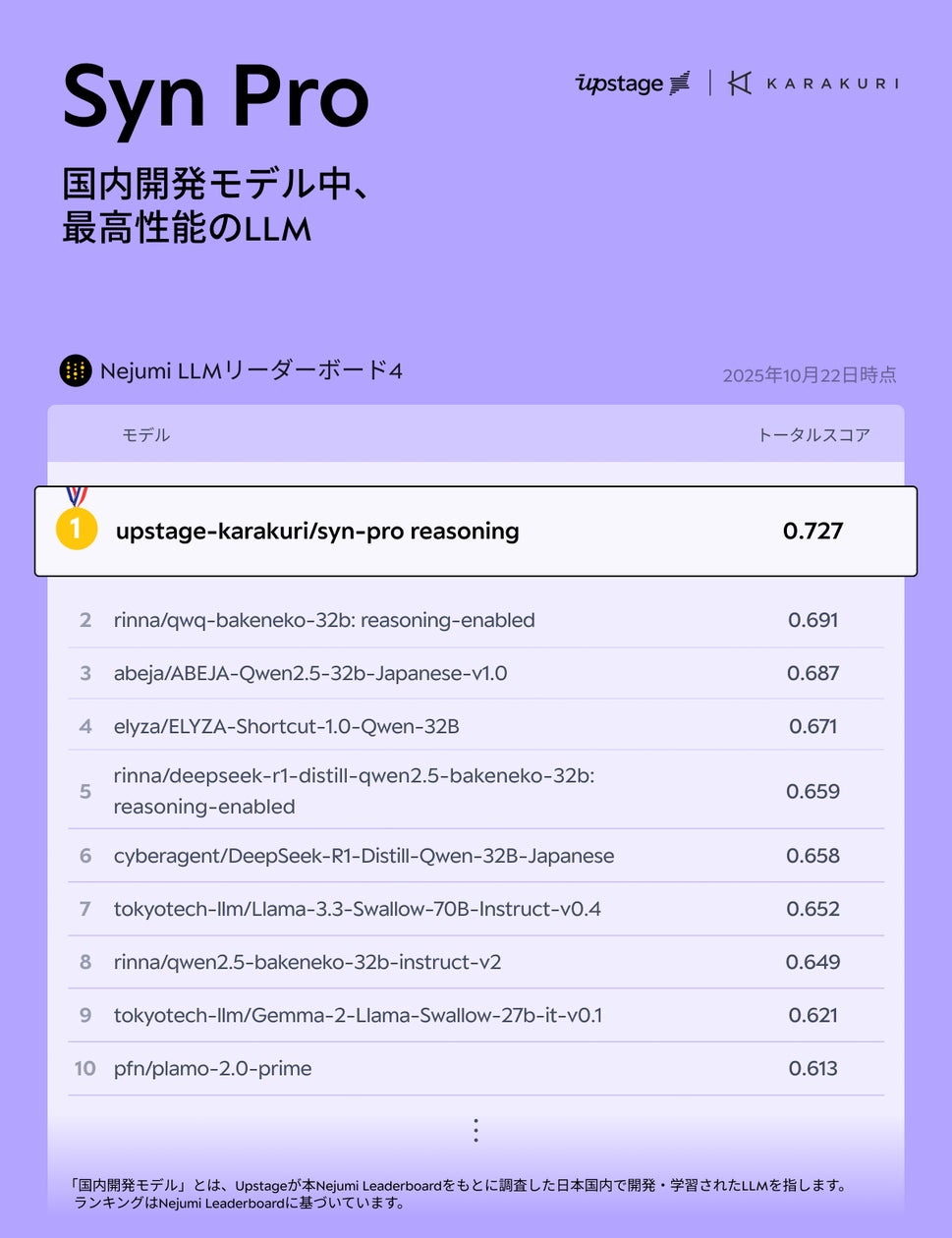 国産LLM開発企業のカラクリ株式会社(東京都中央区:代表取締役CEO 小田志門、以下カラクリ)は、グローバルAIスタートアップであるUpstage AI 株式会社(以下 Upstage)と共同で、次世代型の日本語大規模言語モデル(LLM)「Syn Pro(シン・プロ)」を開発したことを発表します。本モデルは、Weights & Biases Japanが運営するNejumi Leaderboard 4において、32Bパラメータ以下のモデルで日本語性能第1位、かつ世界トップ20入りを果たしました※。さらに、開発コストを従来比約50%削減するなど、グローバル企業との協業によるローカライズの新たな成功モデルを示しました。