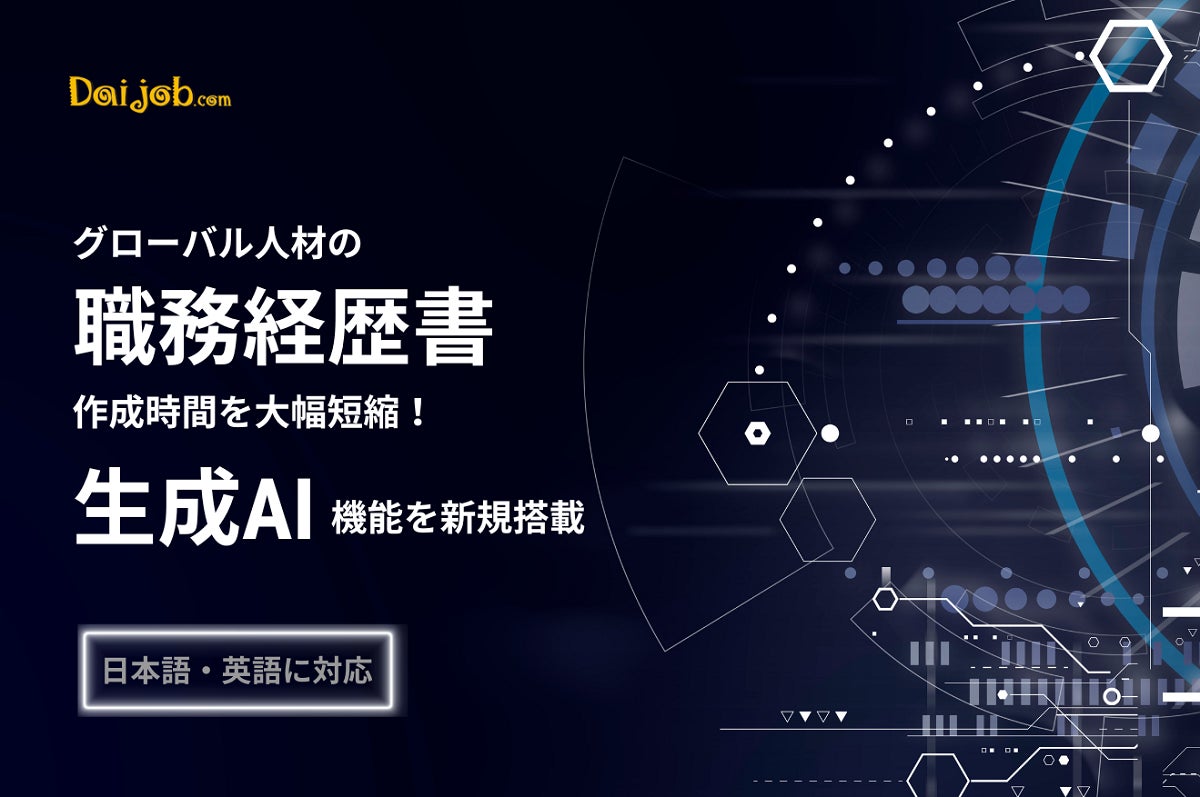 ビジネス・プロフェッショナル×バイリンガルのための転職・求人情報サイト「Daijob.com」を展開するヒューマングローバルタレント株式会社(本社:東京都新宿区、代表取締役:横川 友樹、以下「当社」)は、生成AIを活用して「職務経歴書」が作成できる機能をリリースしました。