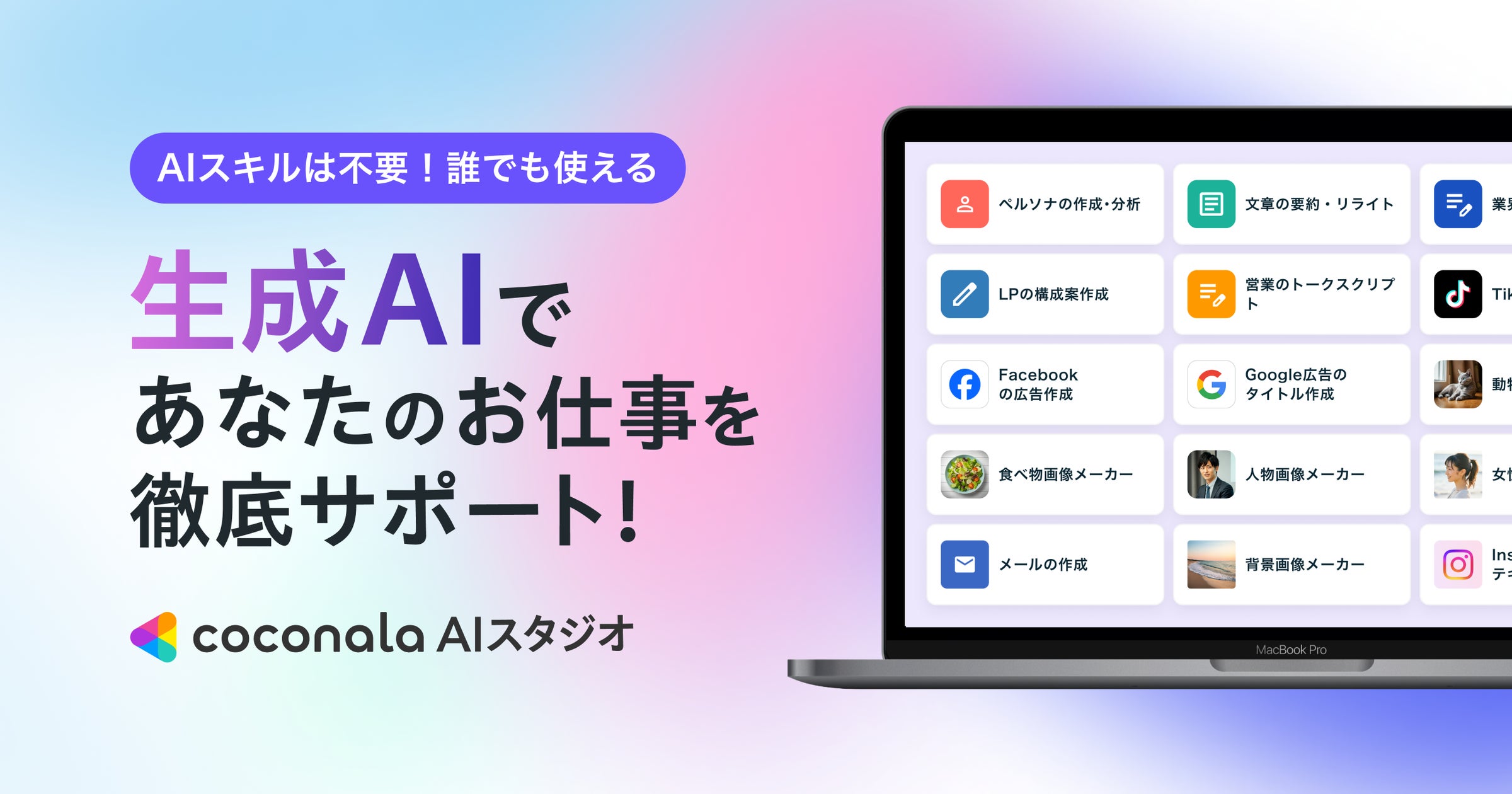 日本最大級のスキルマーケット「ココナラ」をはじめ、「ココナラ募集」「ココナラ法律相談」、4つのエージェントサービスを運営する株式会社ココナラ(本社:東京都渋谷区、代表取締役社長CEO:鈴木 歩、以下ココナラ)は、11月18日(月)にビジネス向け業務サポートAIツール『ココナラAIスタジオ』のサービスを提供開始します。