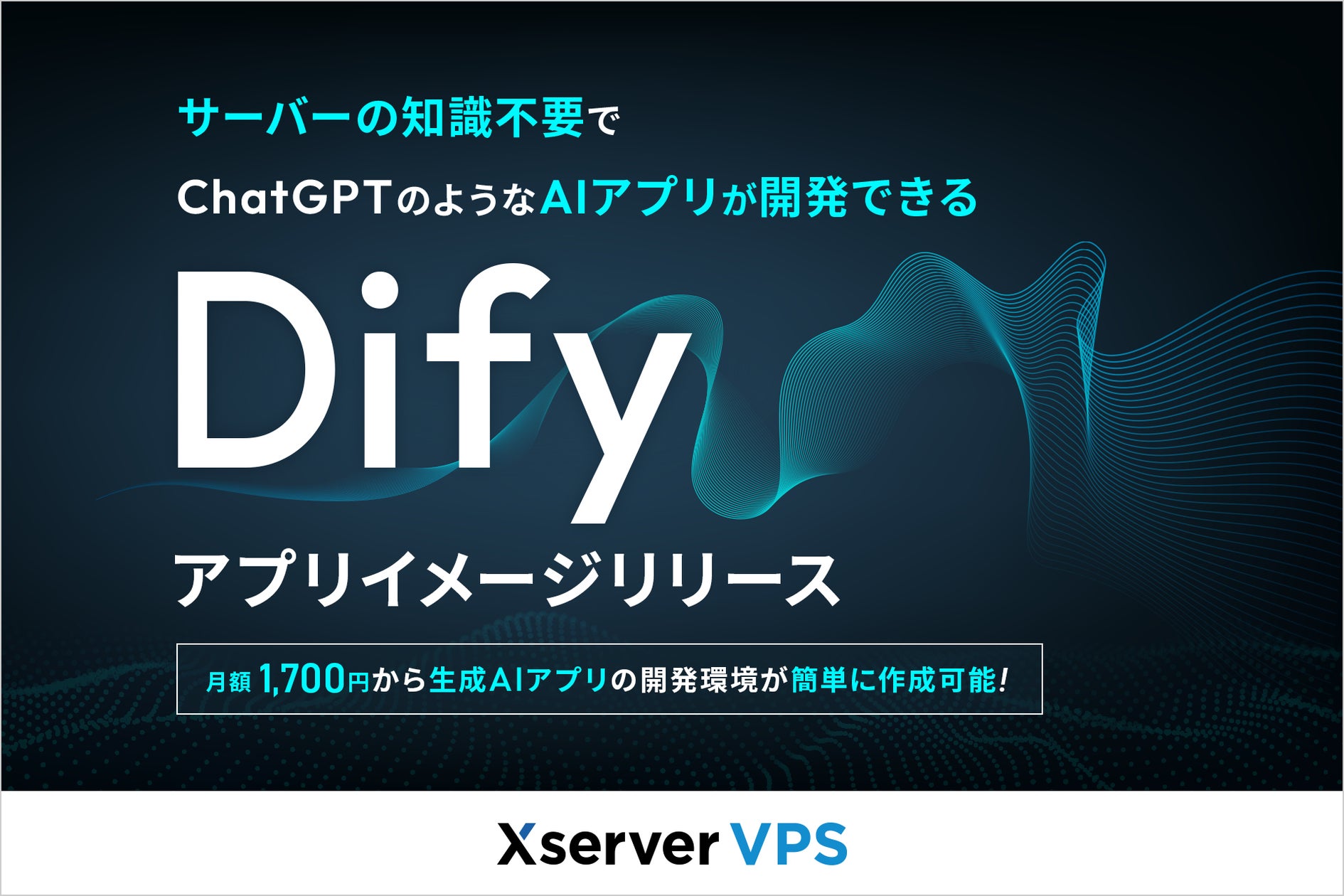 エックスサーバー株式会社(所在地:大阪市北区、代表取締役:小林尚希)は、2024年8月9日、サーバー性能とコストパフォーマンスでNo.1(※1)を誇る『Xserver VPS』において、サーバーの知識不要で簡単に「Dify」の利用環境を構築できるアプリイメージをリリースしました。このアプリイメージをご利用いただくことで、初期費用無料で月額1,700円から「Dify」による生成AIアプリの開発環境をワンタッチで数分以内に自動構築できます。
