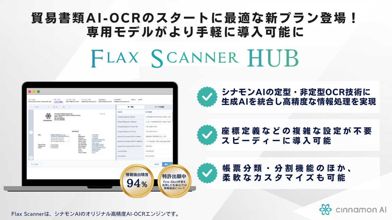 国内の大手企業へAI(人工知能)ソリューションを提供する株式会社シナモン(本社:東京都港区、代表取締役Co-CEO:平野未来/堀田創 以下、シナモンAI)は、AI-OCR×生成AIで企業のデータ活用を拡張する、定型・非定型帳票対応のAI-OCRプラットフォーム「Flax Scanner HUB(フラックス・スキャナー・ハブ)」に、貿易書類の専用AI-OCRモデルを手軽に利用できる新しいプラン「貿易書類 Starterプラン」を、本日8月9日より販売開始します。また、この度の新プラン登場にともない、先着10社限定で、「貿易書類 Starterプラン」の初期費用(20万円[税抜])が無料となる特別キャンペーンも実施します。