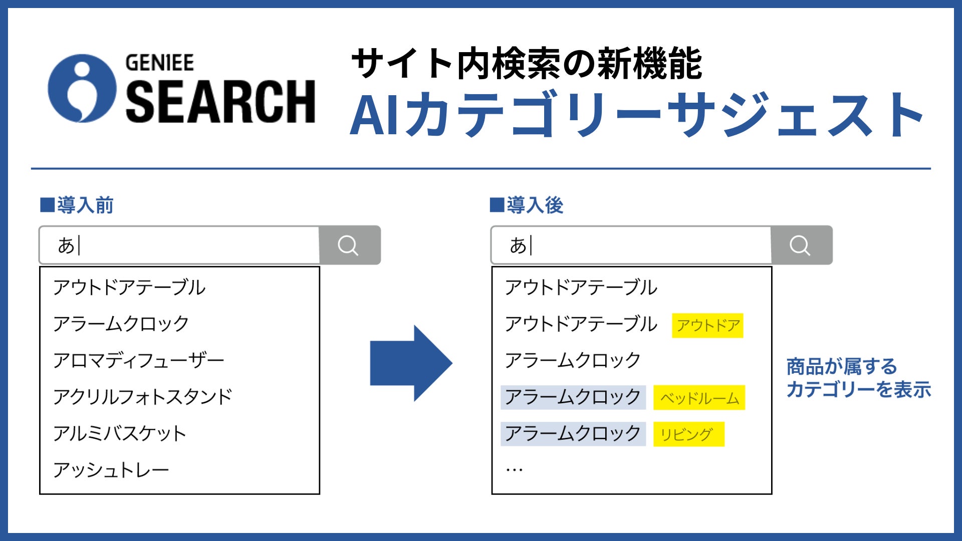 株式会社ジーニー(本社:東京都新宿区、代表取締役社長:工藤 智昭、以下ジーニー)が提供・開発するサイト内検索ツール「GENIEE SEARCH」は、検索キーワードの候補語にカテゴリー情報を連動させる「AIカテゴリーサジェスト」の提供を開始したことをお知らせします。