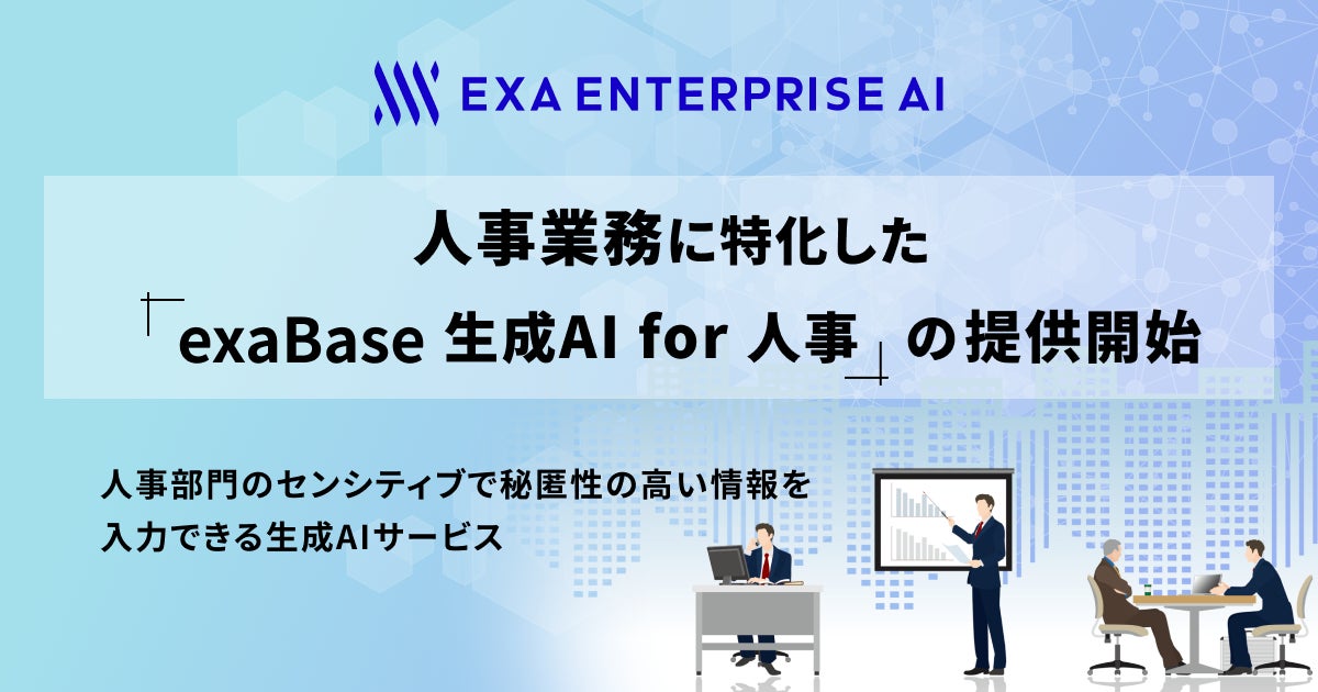 株式会社エクサウィザーズのグループ会社である株式会社Exa Enterprise AI(東京都港区、代表取締役:大植 択真、以下Exa Enterprise AI)は、人事業務に特化したサービス「exaBase 生成AI for 人事」の提供を本日より開始いたします。国内市場シェア1位を獲得した※1exaBase 生成AIは、人事関連部門においても導入され評価をいただいてきました。一方で、センシティブで秘匿性の高い情報を扱うことが多いため、他部門がアクセス可能な状況下では活用が進みづらいという課題がありました。こうした課題を解決し、加えて、人事業務特有の求人票の作成、採用記事の作成、社内研修の準備など、幅広い業務を効率化・高度化することができるプロンプトがセットされたexaBase 生成AI for 人事を提供してまいります。