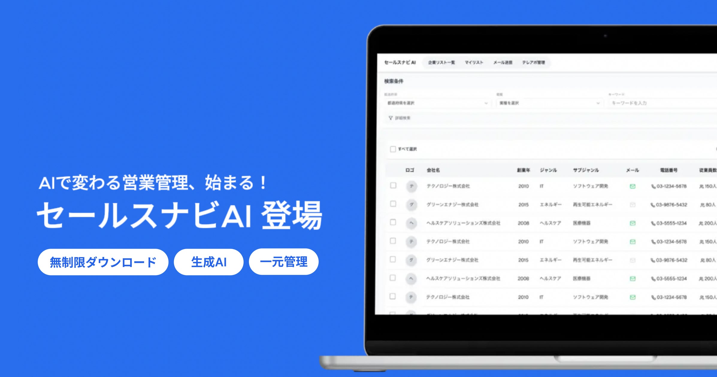 AIソリューションで中小企業の生産性向上と競争力強化を支援する株式会社テクノチェーン(本社:東京都渋谷区、代表取締役社長:岩田照太、以下「テクノチェーン」)は、AI営業管理ツール「セールスナビAI」を10月2日より提供開始いたします。本サービスは、営業リスト作成から顧客管理、テレアポ、メールDMまでを一元管理し、AIエージェントによる自動メール作成機能などを活用して営業プロセス全体を最適化。企業の営業力を最大限に引き出し、効率的な「スマート営業」を実現します。