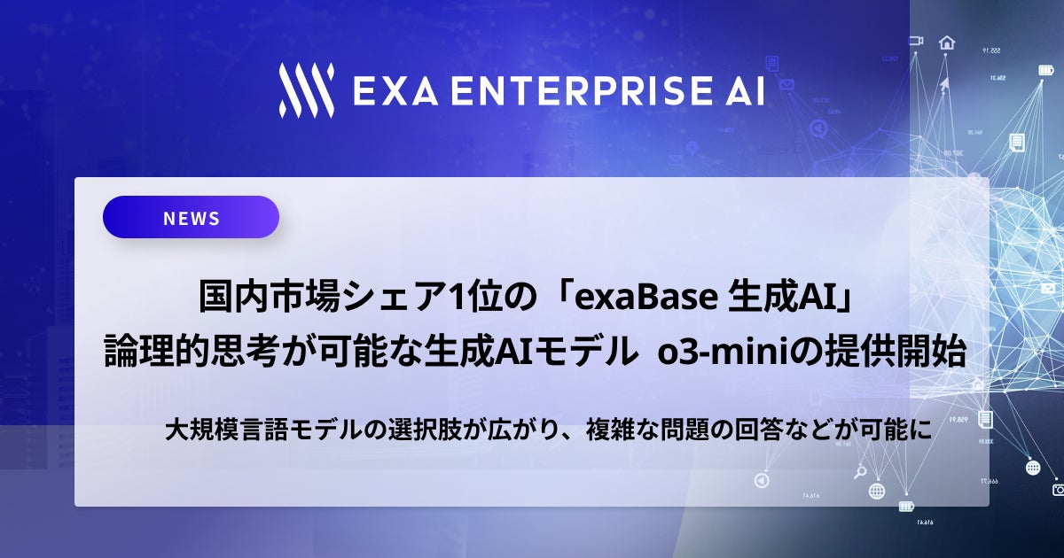 株式会社エクサウィザーズのグループ会社である株式会社Exa Enterprise AI(東京都港区、代表取締役:大植 択真、以下Exa Enterprise AI)は、国内市場シェア1位を獲得した*法人向けChatGPTサービス「exaBase 生成AI」において、OpenAIの論理的思考が可能な生成AIモデルであるo1、o1-mini、o3-miniの提供を開始しました。o1シリーズは、回答を生成する前により多くの時間をかけて思考することで、複雑な問題に対してより正確な回答を導き出すことが可能なモデルです。大規模言語モデル(LLM)の選択肢の幅がさらに広がり、お客様の用途に合わせて使用することが可能です。