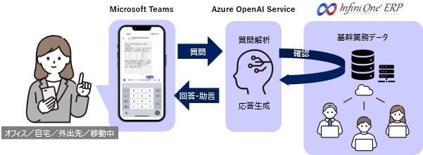 FutureOne株式会社(本社:東京都品川区、代表取締役社長:佐藤 隆元、以下フューチャーワン)は、かねてより提供していた中堅・中小企業向け基幹業務システムInfiniOne®と、Microsoft Teams (以下Teams)との連携機能に対して、2024年7月よりAzure OpenAI Serviceを活用した生成AI機能を追加したことをお知らせします。この機能拡張により、ユーザーはInfiniOne®を起動せずにTeamsチャット上で自然言語による基幹業務データとの対話が可能となり、手軽な情報把握に加え、生成AIによる業務アクションのサポートを受けられるようになります。