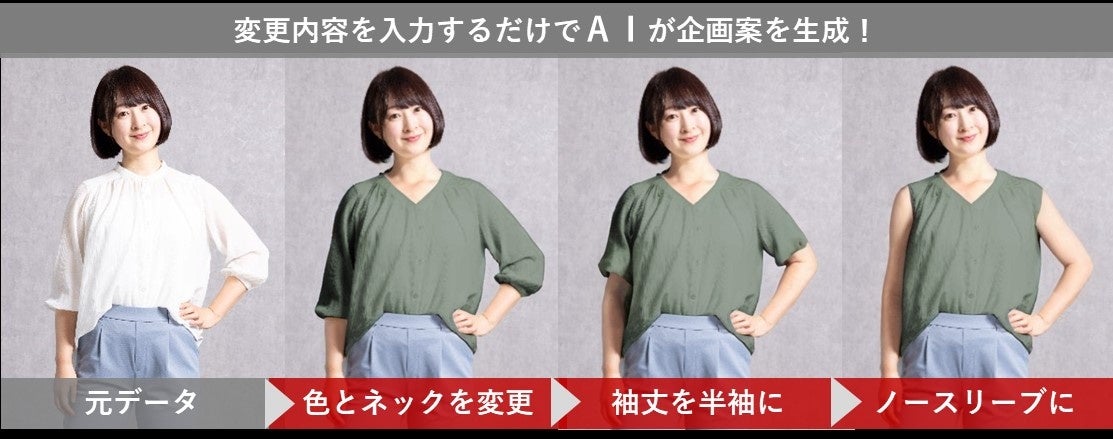 デザイン変更や色・柄の変更を、わずか数クリック・数秒で実施することができるため、アパレル企画業務の大幅な時間短縮が期待できます。難しいプロンプト(テキスト処理)を必要とせず、クリックやドラッグで直感的に操作することが可能です。