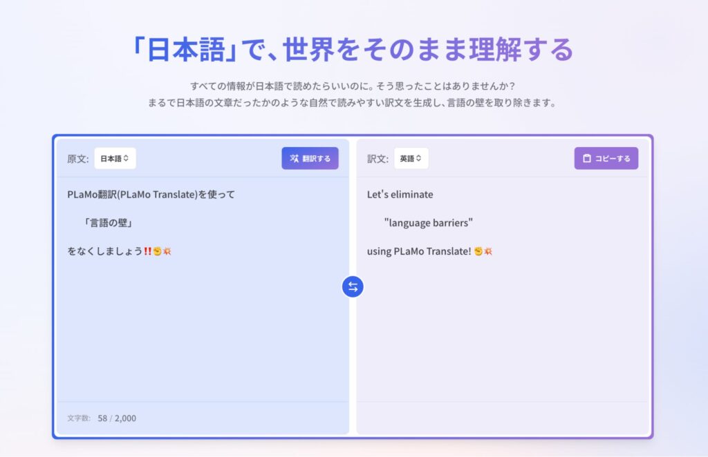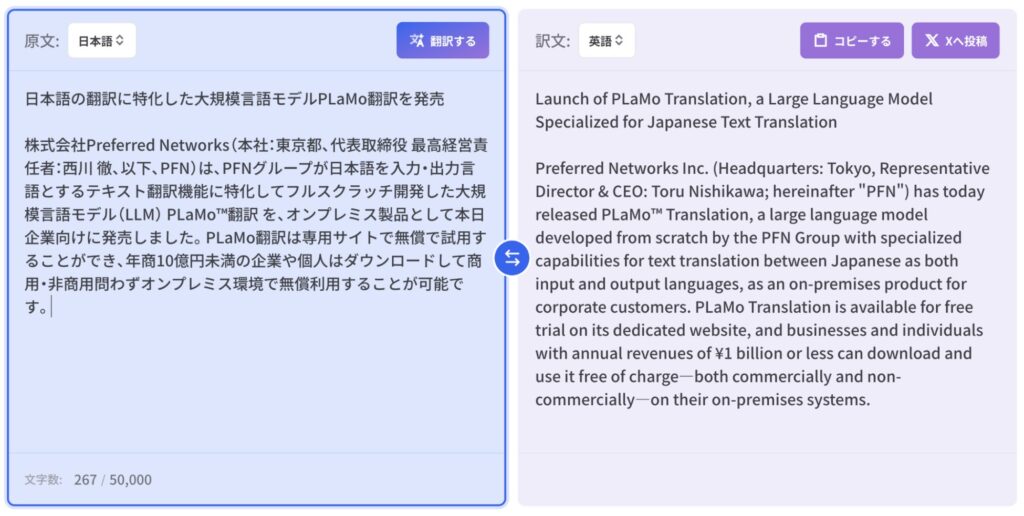 株式会社Preferred Networks(本社:東京都、代表取締役 最高経営責任者:西川 徹、以下、PFN)は、日本語を入力・出力言語とするテキスト翻訳に特化してPFNがフルスクラッチ開発した大規模言語モデル(LLM) PLaMo™翻訳のサブスクリプションサービスの提供を本日開始しました(サービスサイト: https://translate.preferredai.jp)。本サービスでは、月間利用上限のあるFreeプランを無料で、文書読解用途での利用を主とするライトユーザー向けの Liteプラン をリリースキャンペーン価格の月額980円(税込1,078円)・年額9,800円(税込10,780円)で提供します。
