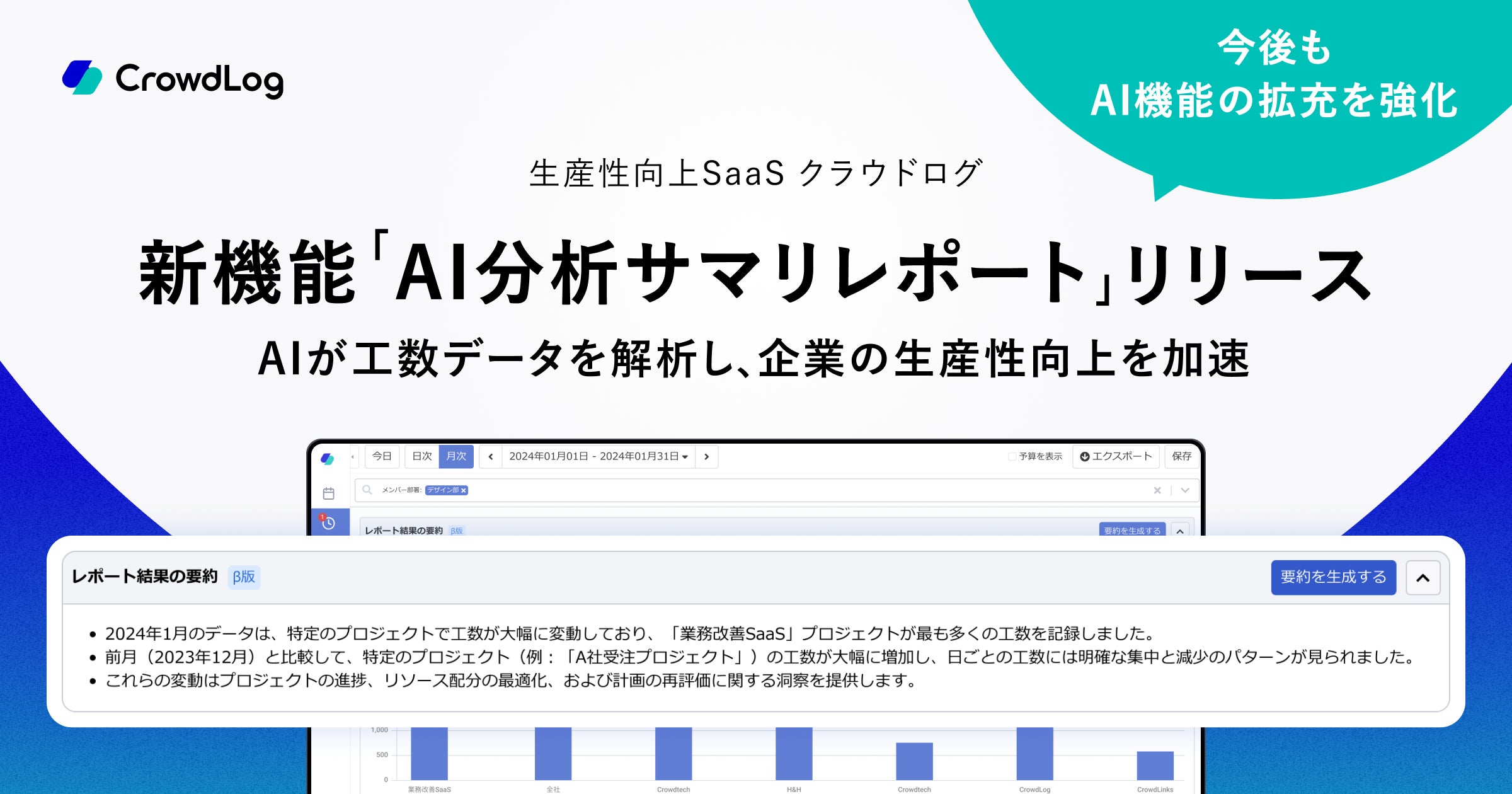 企業と個人をつなぐオンライン人材マッチング事業を展開する株式会社クラウドワークス(本社:東京都渋谷区 代表取締役社長 兼 CEO:吉田 浩一郎 以下「当社」)が運営する生産性向上SaaS「クラウドログ」は、2024年8月27日より、新機能「AI分析サマリレポート」を提供開始いたします。