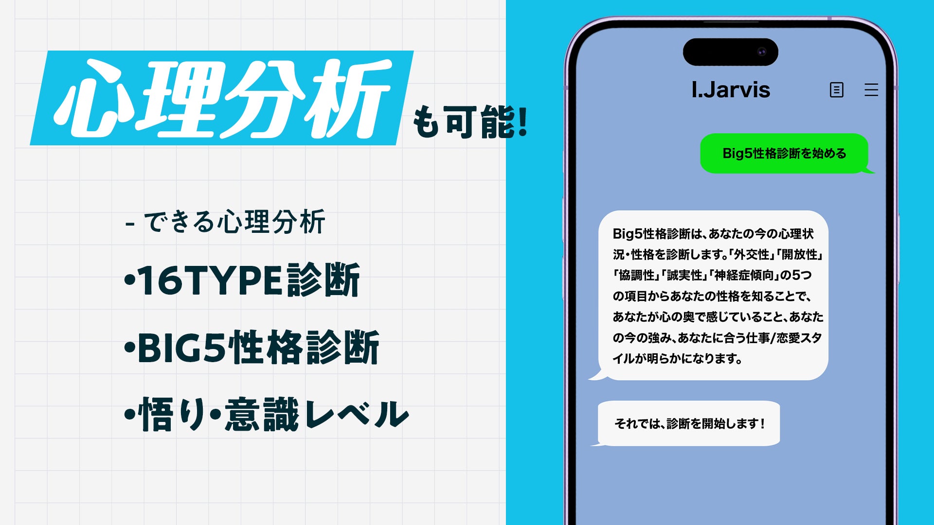 I.Jarvisでは、心理分析を行うことができます。現在できる心理分析は、16TYPE診断・BIG5性格診断・悟り/意識レベルの三つになっております。