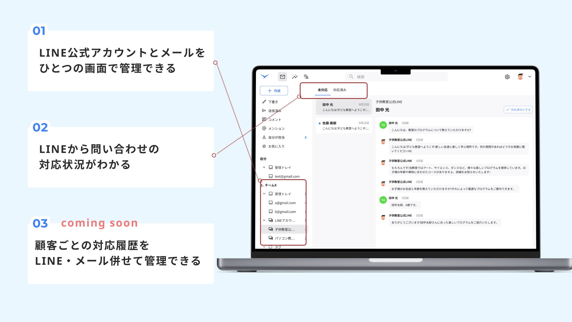 メール・LINEの問い合わせを一元管理できるようにすることで、画面切り替えの手間や対応漏れを0に