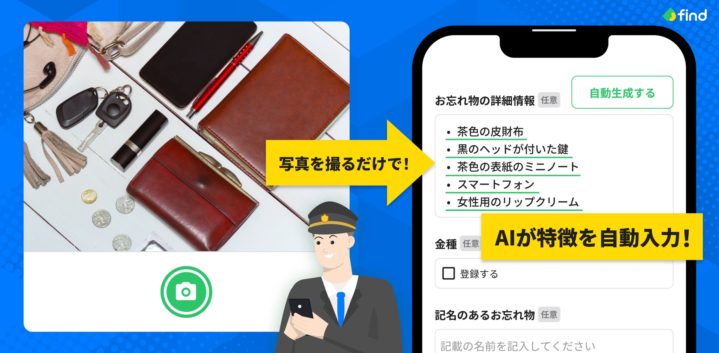 本機能は、拾得物を登録する「find Scan」にて落とし物の写真を撮影すると、ChatGPTをはじめとした生成AIが落とし物の特徴を自動で入力します。今まで拾得物の情報登録には平均5分の時間を要していましたが、これにより約20秒で可能となり、拾得物登録業務の効率化を図ります。