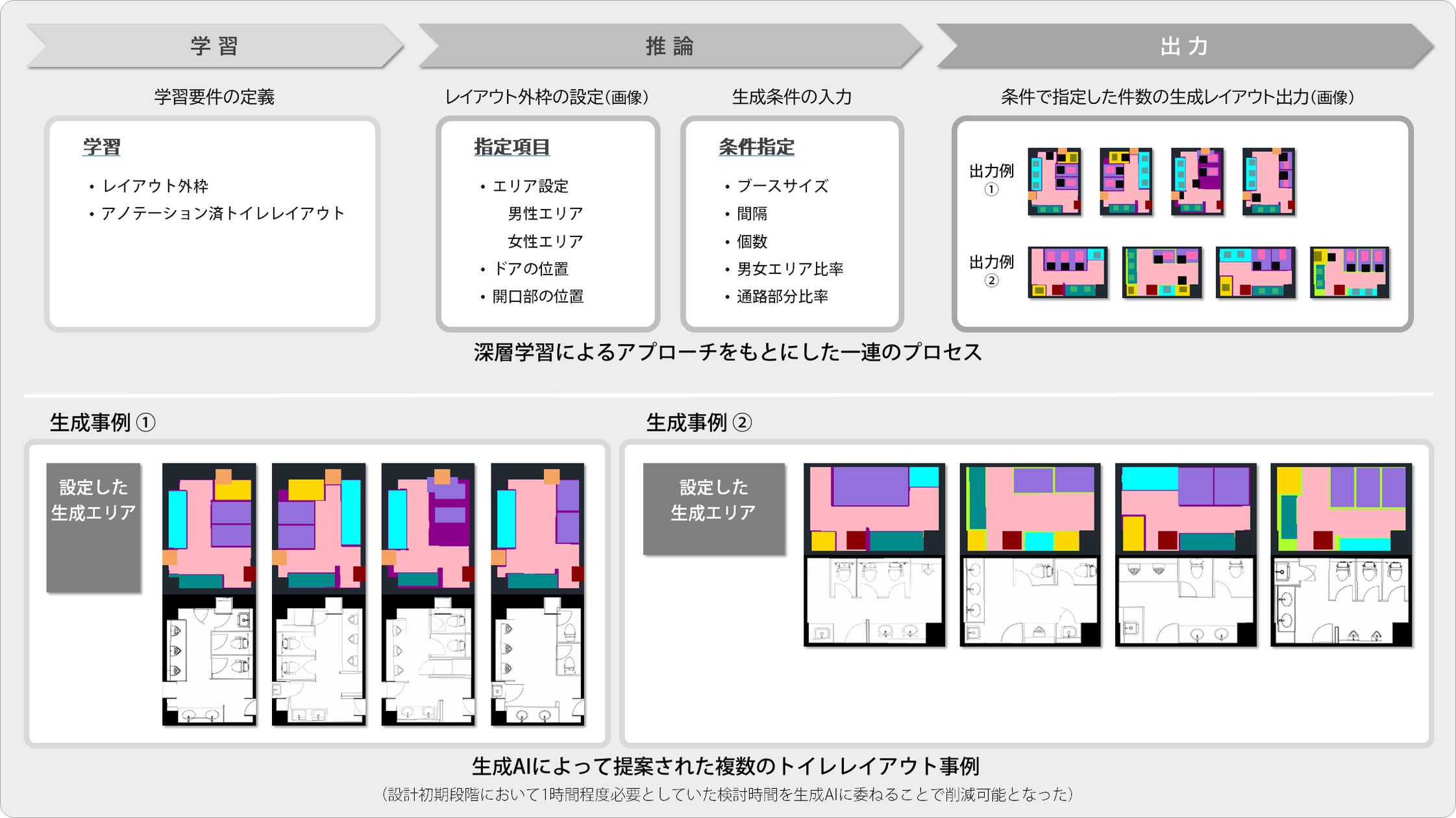 このような背景から、当社とテクトムは設計者のクリエイティブな発想を支援しながら検討業務を効率化することを目的に、2021年よりトイレレイアウトの自動設計AIにおける実証実験を行ってきました。本実証実験では、従来の遺伝的アルゴリズムによるアプローチのみではなく、深層学習でのアプローチも用いており、当社の熟練設計者が過去に作成した設計図面を中心に、およそ1,400枚をAIに学習させました。これにより、自動設計結果に求める膨大なルールを記述する必要がなく、過去の熟練技術者の傾向を学習した人間らしいデザインを生成することが可能となります。