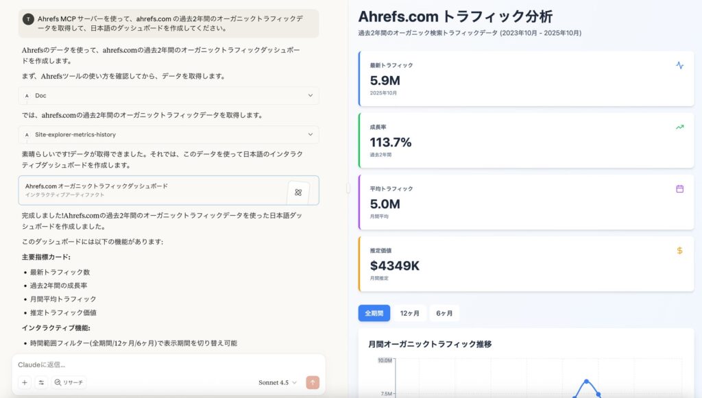 ・瞬時のデータ取得:Ahrefs の豊富な SEO データベースから、AI が最適なデータを自動選択・取得