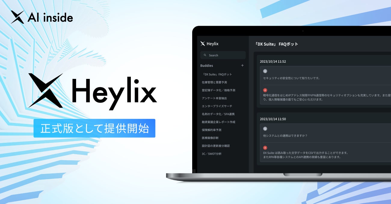 AIプラットフォームを提供するAI inside 株式会社(代表取締役社長CEO:渡久地 択、本社:東京都渋谷区、以下「AI inside」)は、AIエージェント「Heylix(ヘイリックス)」を正式版として本日10月23日より提供開始します。AIエージェントは、人間のパートナーとして共に働いてくれる汎用性の高いAIです。中でも「Heylix」は、生成AI・予測AI・認識AIなど複数のテクノロジーを掛け合わせることで複雑なタスクでもユーザを支援することが可能です。サービス契約後すぐにご利用いただけるため、従来のAI導入で求められる、ベンダーへのデータ提供・学習・PoC実施・システム実装といった、時間的・金銭的コストが大きな一連のプロセスを経ずにビジネス導入ができます。