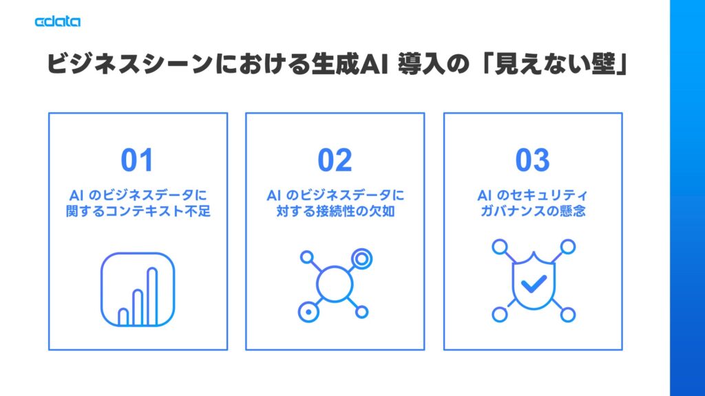 生成AI の業務活用が進まない主な理由として、以下の3つの課題が挙げられます。