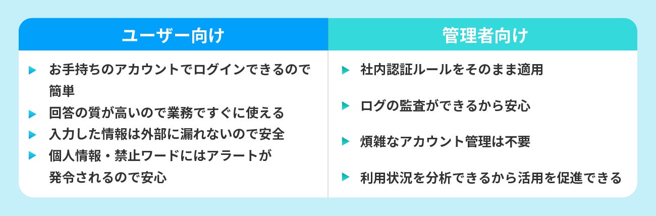 情報漏洩を防止すると共に業務生産性を向上するためのビジネス利用に特化。