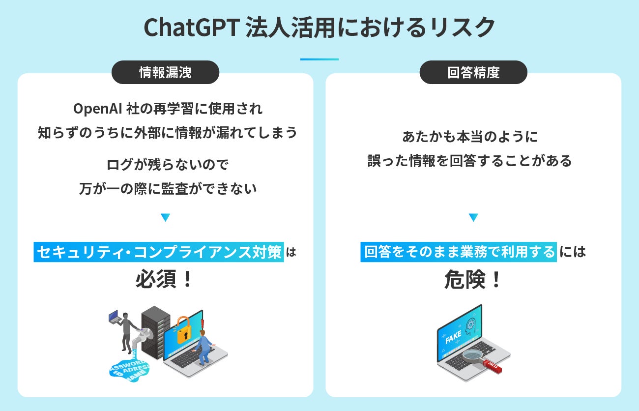 しかし、ChatGPTをそのまま企業に導入すると、情報漏洩のリスク等危険が伴います。
