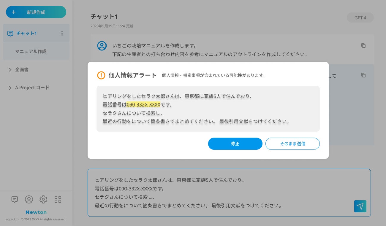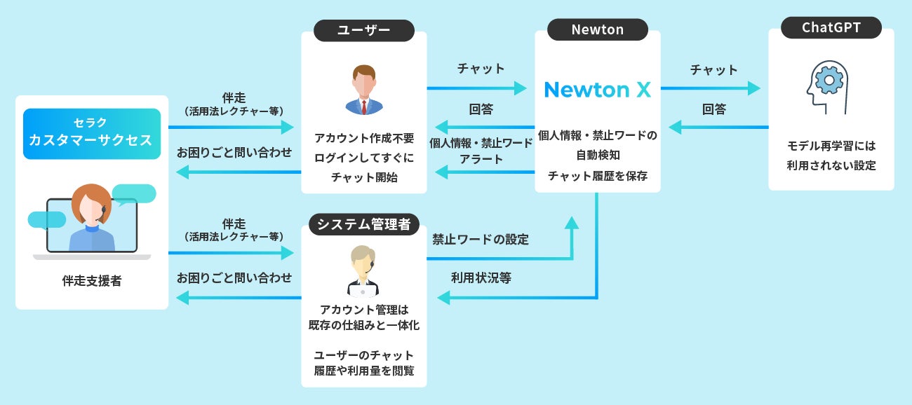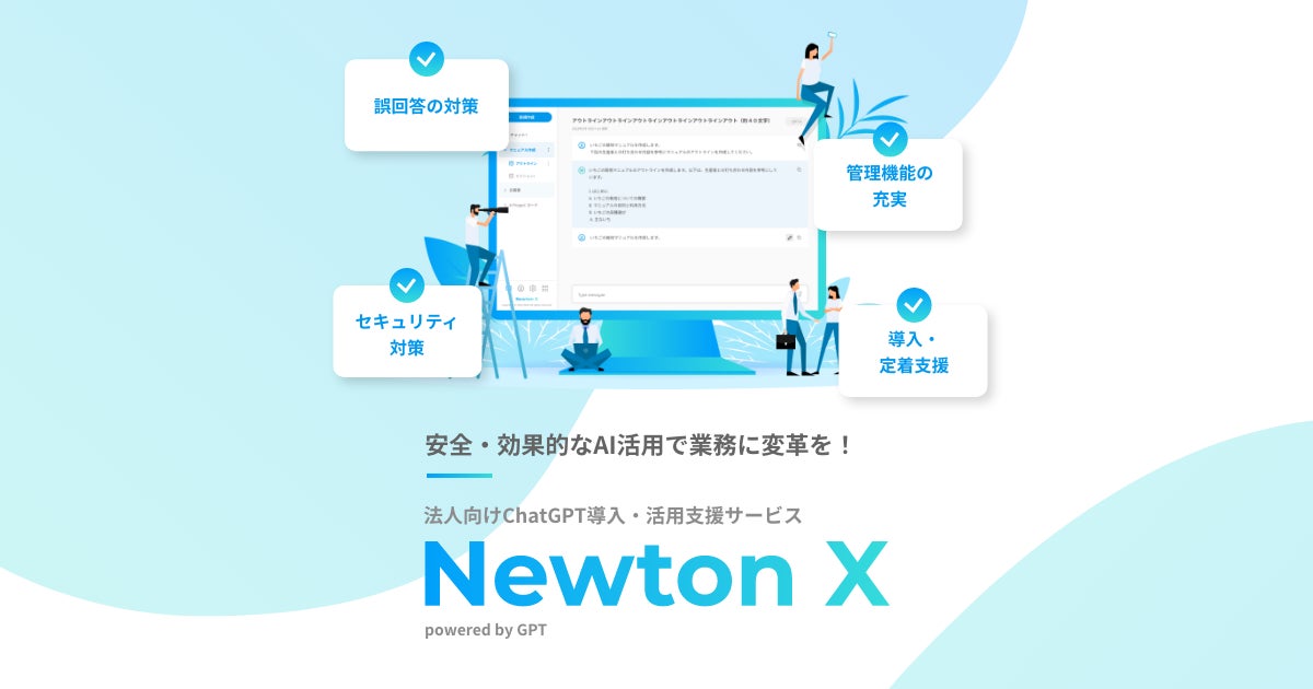 株式会社セラク(東京都新宿区、代表取締役:宮崎 龍己、以下当社)は、企業向けの生成・対話型AIサービス「Newton X」の予約受付を開始いたします。どのような企業でも安心安全に生成・対話型AIを本格的に利用できるように、「ChatGPT」の課題とされるセキュリティの確保やコンプライアンス遵守、誤回答(ハルシネーション)抑制の機能が標準で搭載され、さらに、プロンプト(ChatGPTに与える指示)作成の補助機能やユーザー間でのチャットの共有機能を利用できます。