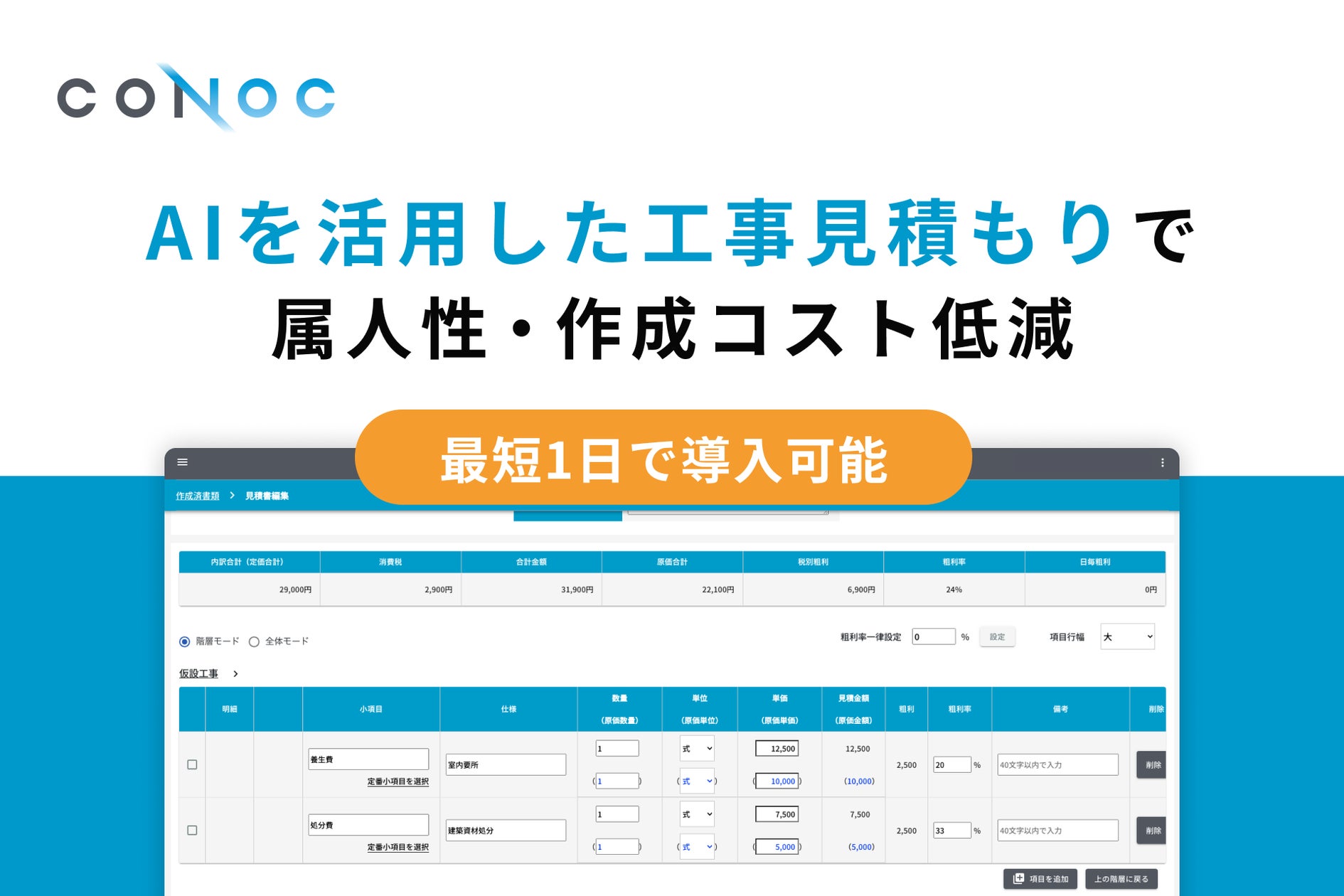 建設業界のDXを推進する株式会社CONOC(本社:東京都渋谷区、代表取締役:山口一、以下:CONOC)が提供するCONOC業務管理クラウドに、過去の見積もり実績データを機械学習し、一定水準の見積もりを即時に算出するAI見積もり機能をリリースしたことをお知らせいたします。