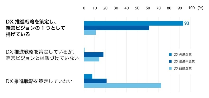 有限責任 あずさ監査法人の調査によると、DX先進企業の93%はDX戦略を経営ビジョンの柱の一つとして掲げています。