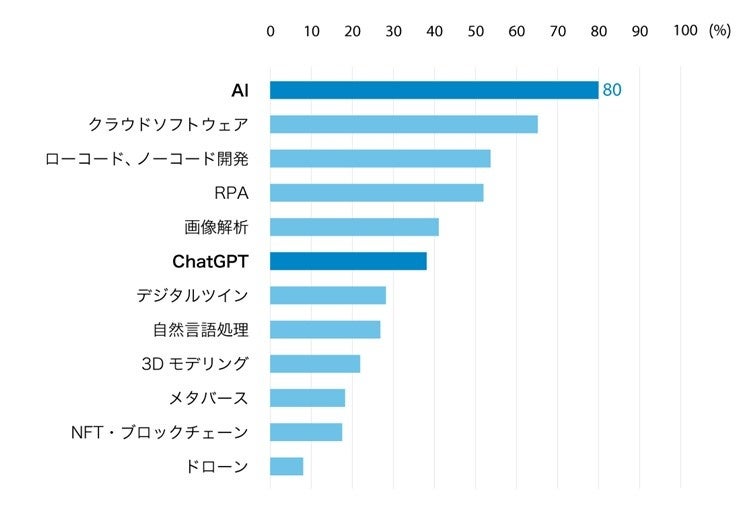 また、「DX推進のために重要なデジタル技術はAI(人工知能)」と80%の企業が回答しています。ChatGPTに代表される生成AIついても40%近い回答が得られており、DX先進企業からのAIに対する高い関心が伺えます。