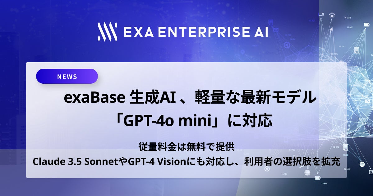 株式会社エクサウィザーズのグループ会社である株式会社Exa Enterprise AI(東京都港区、代表取締役:大植 択真、以下Exa Enterprise AI)は、法人向けChatGPTサービス「exaBase 生成AI」において、米OpenAI社が7月18日(現地時間)に発表した最新生成AIモデルである「GPT-4o mini」に、7月23日(火)より対応することをお知らせします。GPT-4o miniは、すでに対応済みのGPT-4oの小型モデルであり、高速かつ安価に利用できることが特徴です。従量料金は無料で提供します。exaBase 生成AIは、Claude 3.5 SonnetやGPT-4 Visionにも対応しており、基盤モデルの選択肢を今後も拡充していきます。