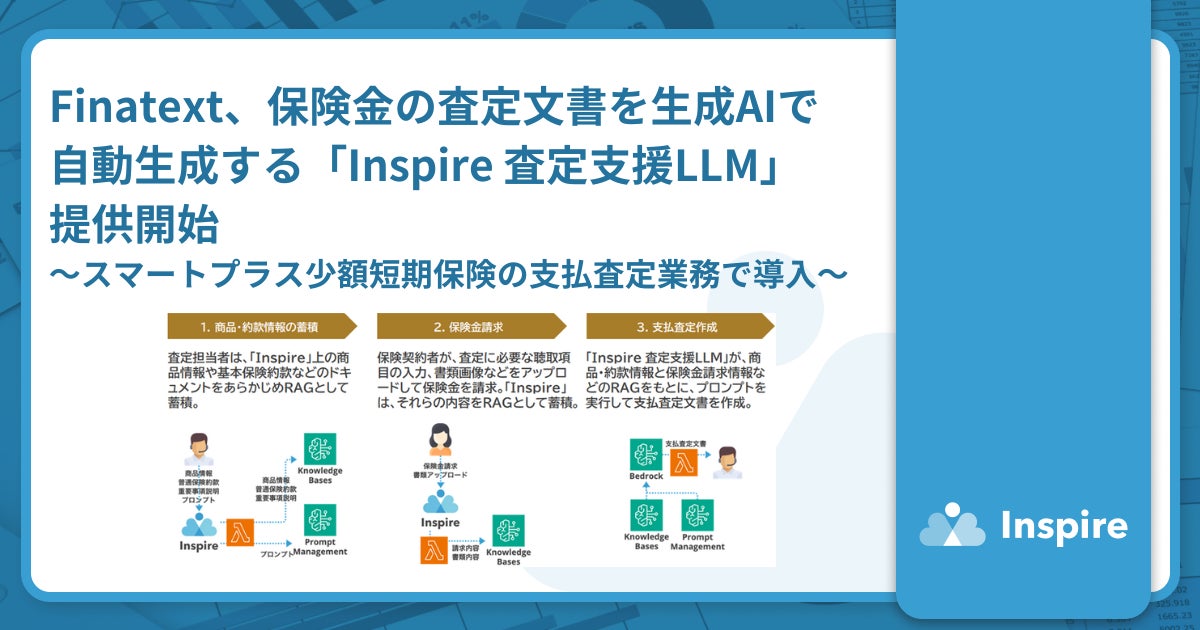 次世代金融インフラの提供を通して組込型金融を実現するFinatextグループの株式会社Finatext(本社:東京都千代田区、代表取締役CEO:木下 あかね、以下「Finatext」)は、SaaS型デジタル保険システム「Inspire(インスパイア)」にて、保険金の査定文書を生成AIで自動生成する機能「Inspire 査定支援LLM」の提供を2025年3月4日(火)から開始しました。本機能は、スマートプラス少額短期保険株式会社(本社:東京都千代田区、代表取締役:小山 宏人、以下「スマートプラスSSI」)の支払査定業務で導入されています。