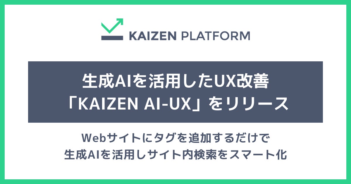 株式会社Kaizen Platform(本社:東京都港区、代表取締役:須藤 憲司、以下「Kaizen Platform」)は、UX改善において、生成AIを活用する新たなメニュー 「KAIZEN AI-UX」の提供を開始します。その第一弾としてWebサイト内の検索機能を生成AIを活用してスマート化するメニューをリリースします。実装にむけた要件定義や機能開発はKaizen Platformが実施し、お客様はWebサイトにタグを追加するだけで簡単に機能の実装が可能となります。