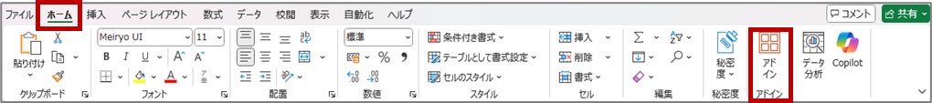 1. Microsoft Exel [ ホーム > アドイン] を選択